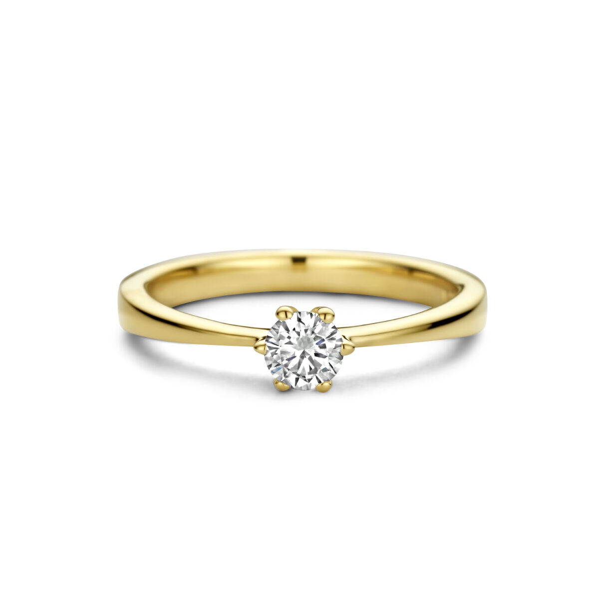 14k Geelgouden ring uitgevoerd met een schitterende diamant. De ring heeft een breedte van 4.5mm.