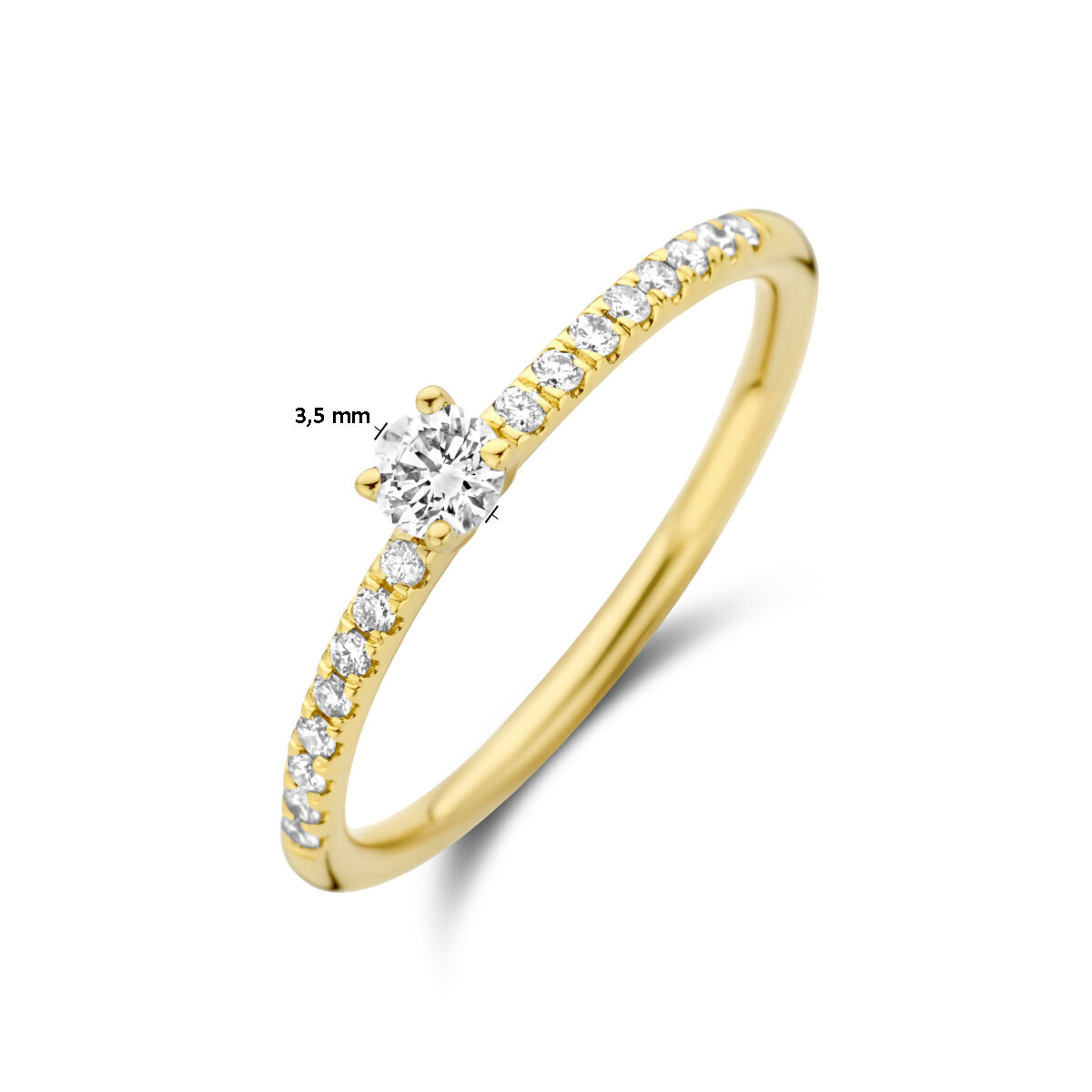 14k Geelgouden ring uitgevoerd met schitterende diamanten. De ring heeft een breedte van 3.5mm en het diamantgewicht is 0.30ct. De solitair diamant heeft een diamantgewicht van 0.15ct.