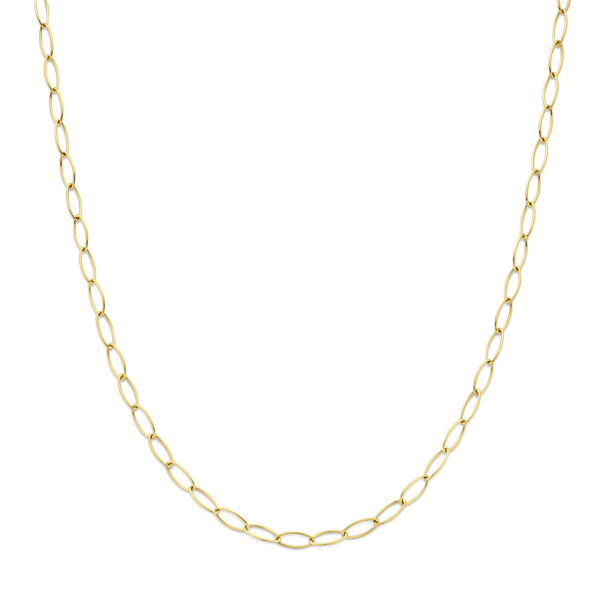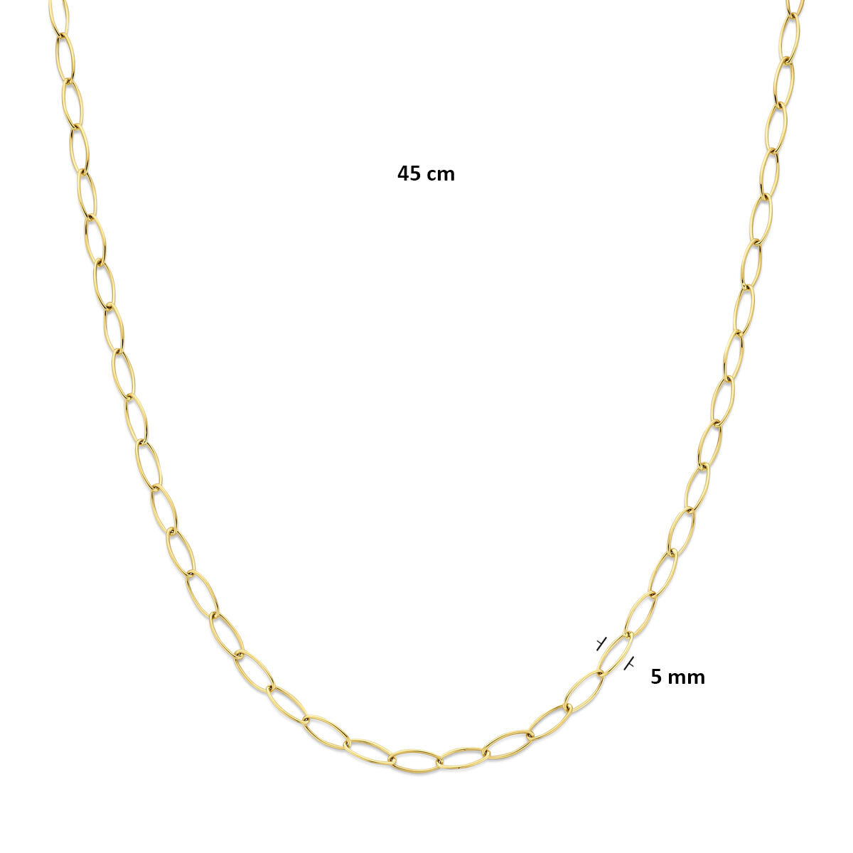 14k Geelgouden collier met een schakelbreedte van 5mm en een draaglengte van 5mm. Uitgevoerd met een karabijnsluiting.