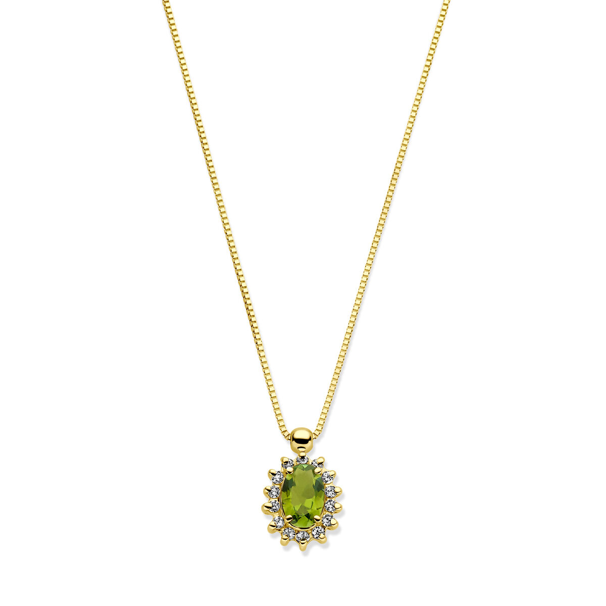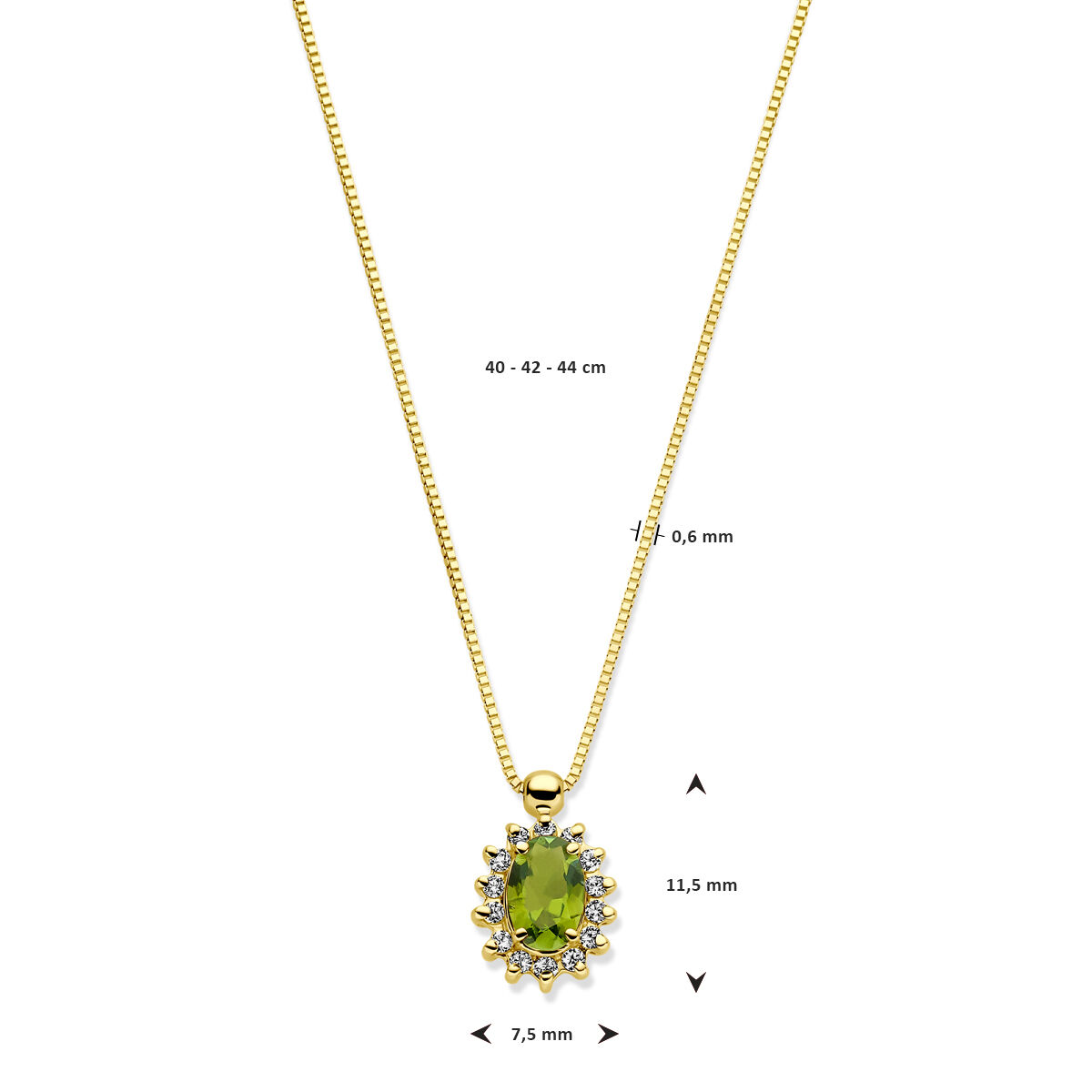 14k Geelgouden collier uitgevoerd met toermalijn en diamant. Het collier heeft draaglengtes van 40-42-44cm en is uitgevoerd met karabijnsluiting. Het diamantgewicht is 0.11ct. De schakelbreedte is 0.6mm.