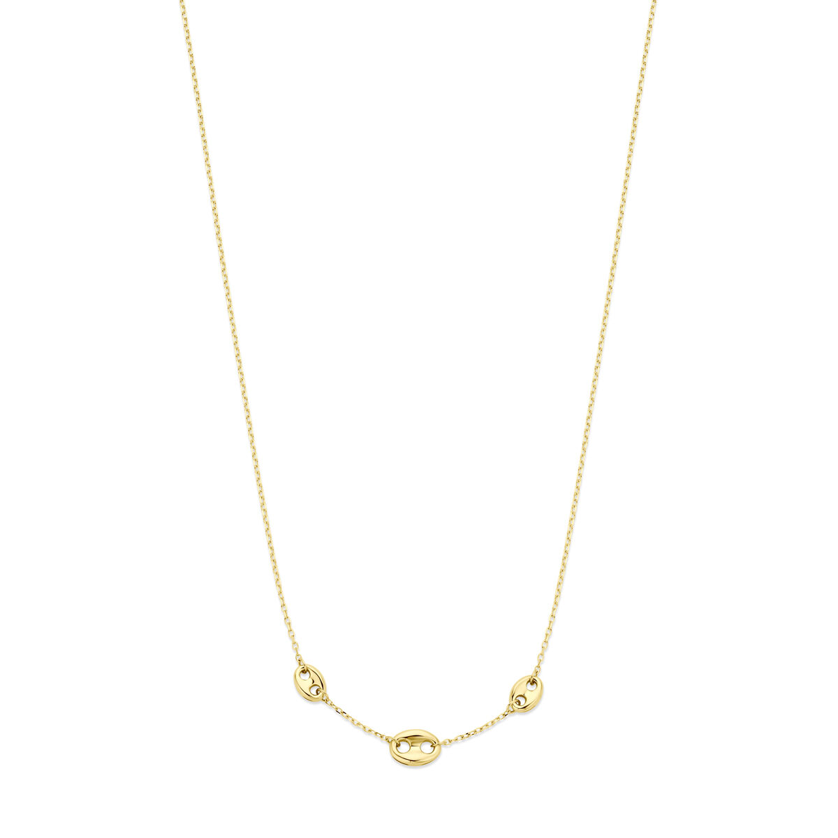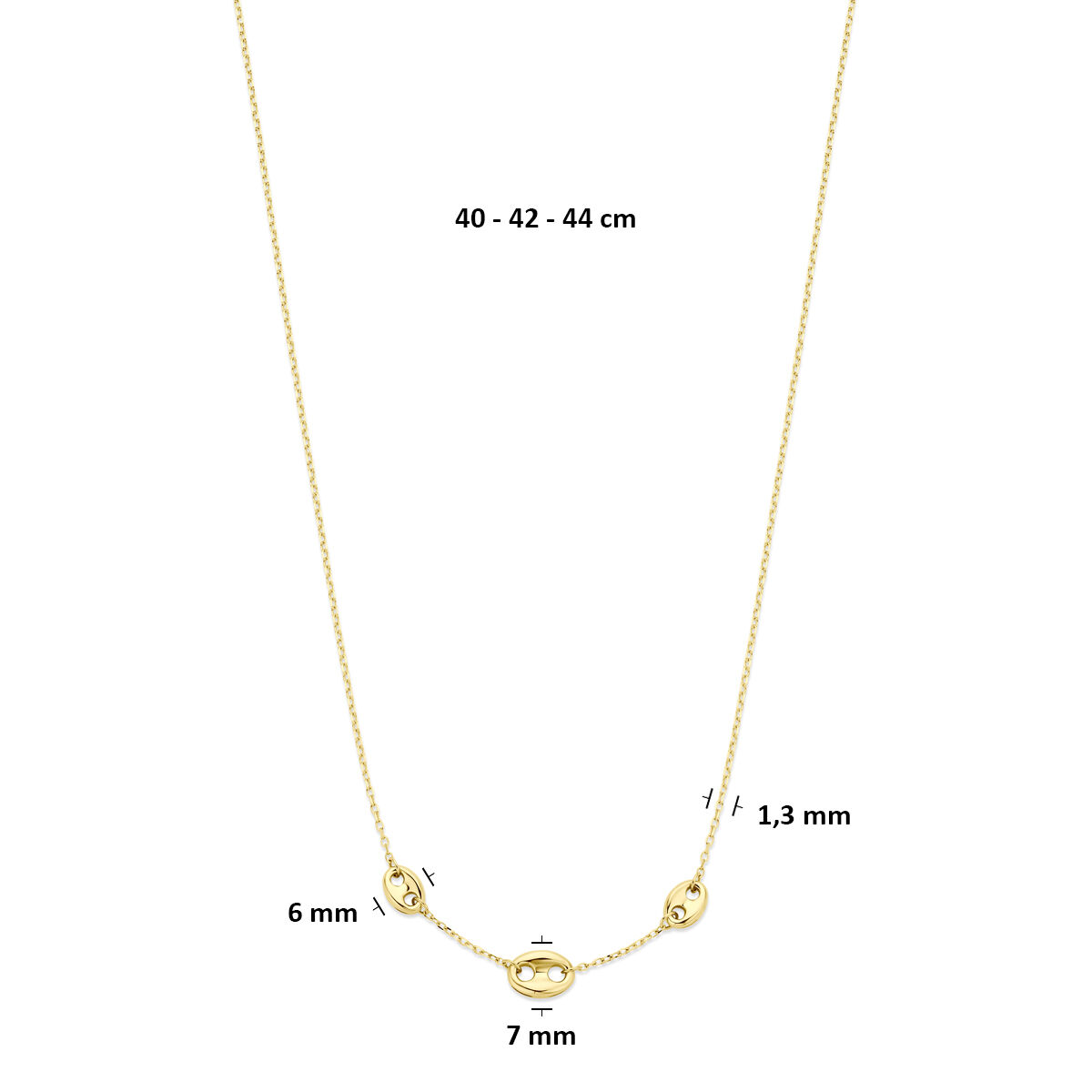 14k Geelgouden collier met koffieboon tussenschakels van 7 en 6mm en een draaglengte van 40-42-44cm. Uitgevoerd met karabijnsluiting.
