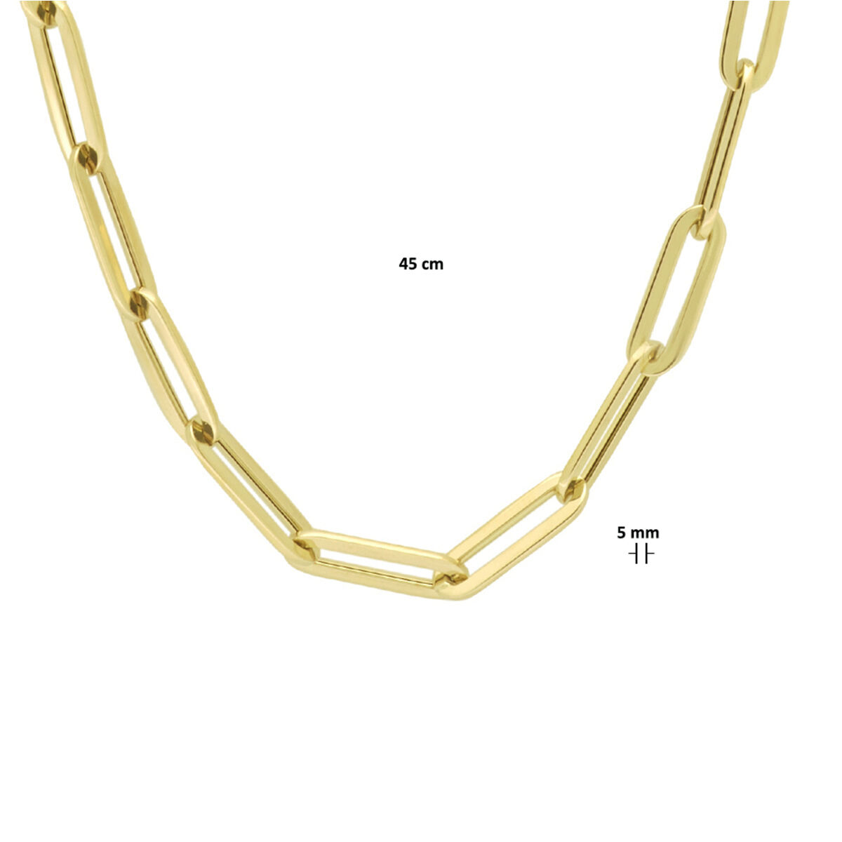 Geelgouden collier met een 5.0mm breed paperclip schakel en een lengte van 45cm uitgevoerd met een karabijn sluiting.