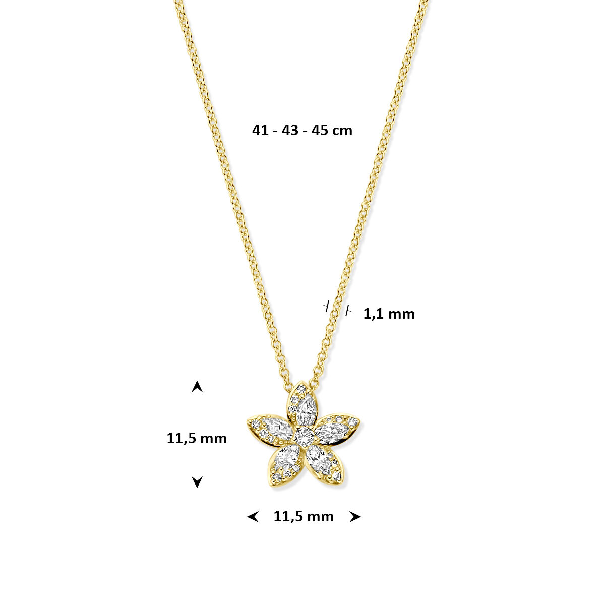 14k Geelgouden collier uitgevoerd met een bloem en diamant. Het collier heeft draaglengtes van 41-43-45cm. Het totale diamantgewicht is 0.42ct. Uitgevoerd met karabijnsluiting.