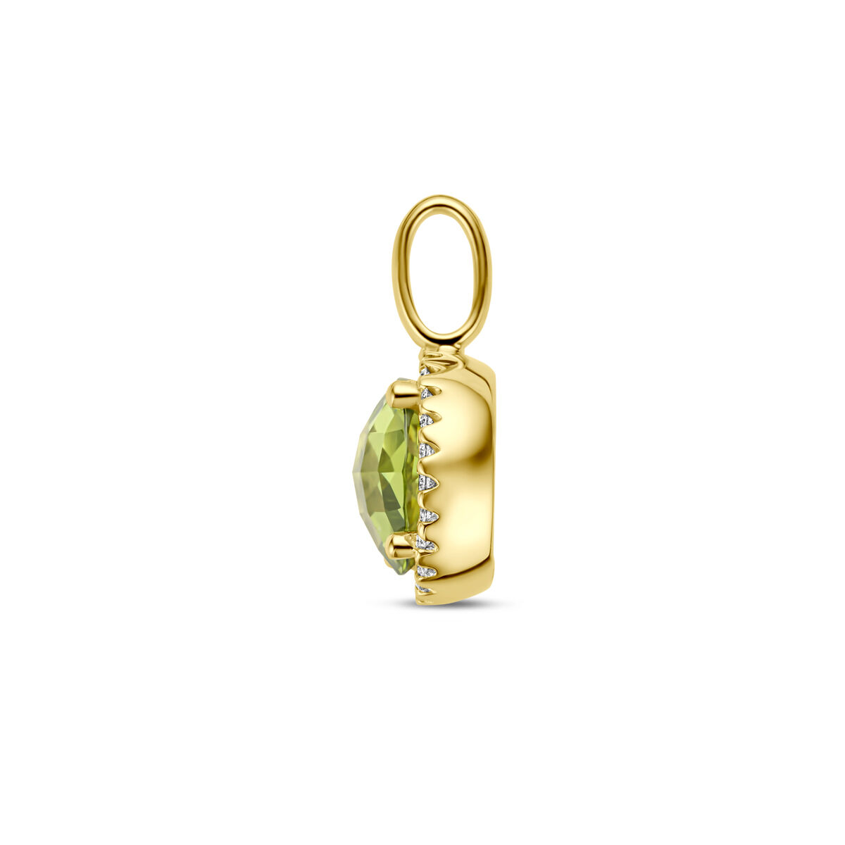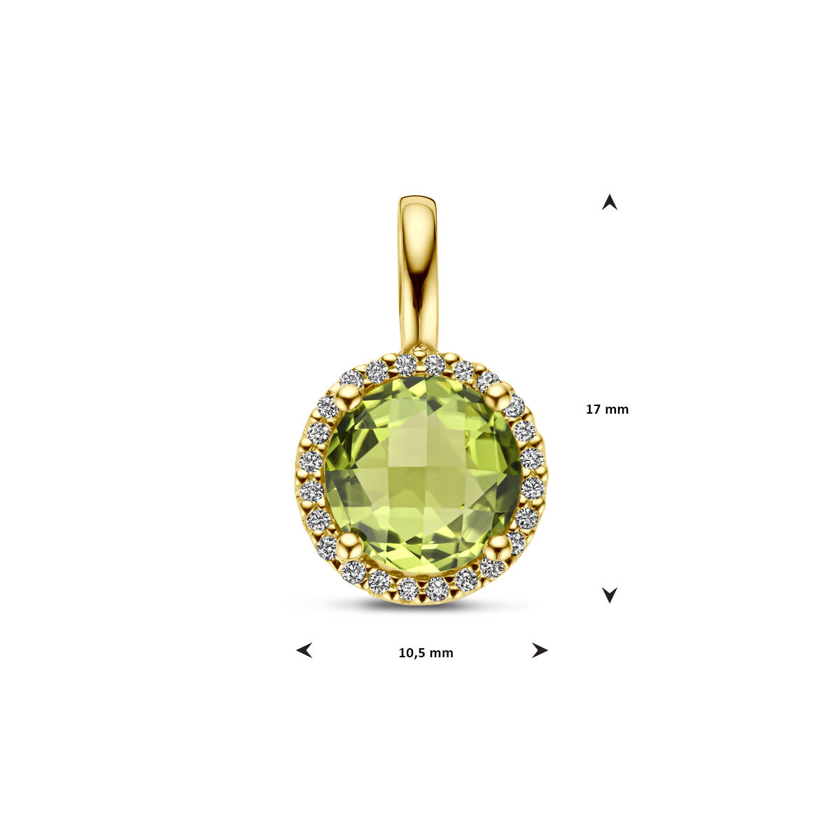 14k Geelgouden hanger uitgevoerd met peridot en diamant. De hanger heeft een afmeting van 17x10.5mm. Het diamantgewicht is 0.09ct.