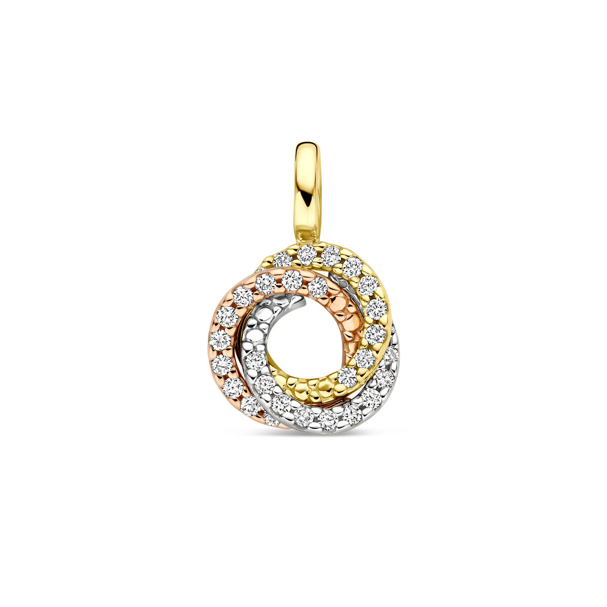 14k Tricolor wit- rosé- en geelgouden hanger uitgevoerd met diamant. De hanger heeft een totale hoogte van 14mm. Het totale diamantgewicht is 0.13ct.