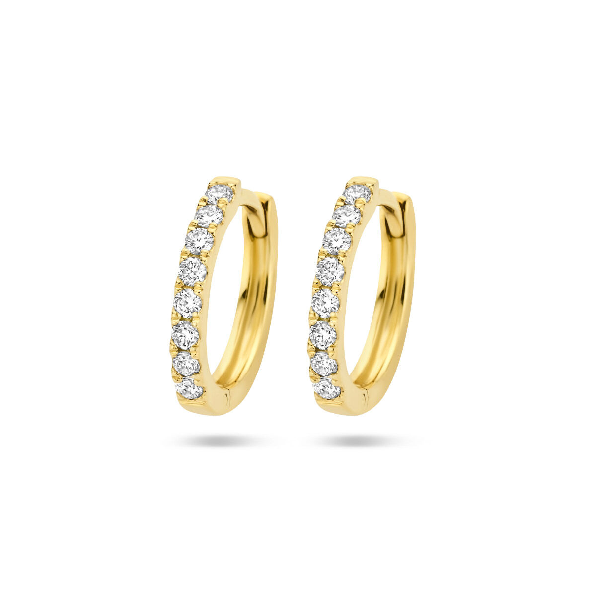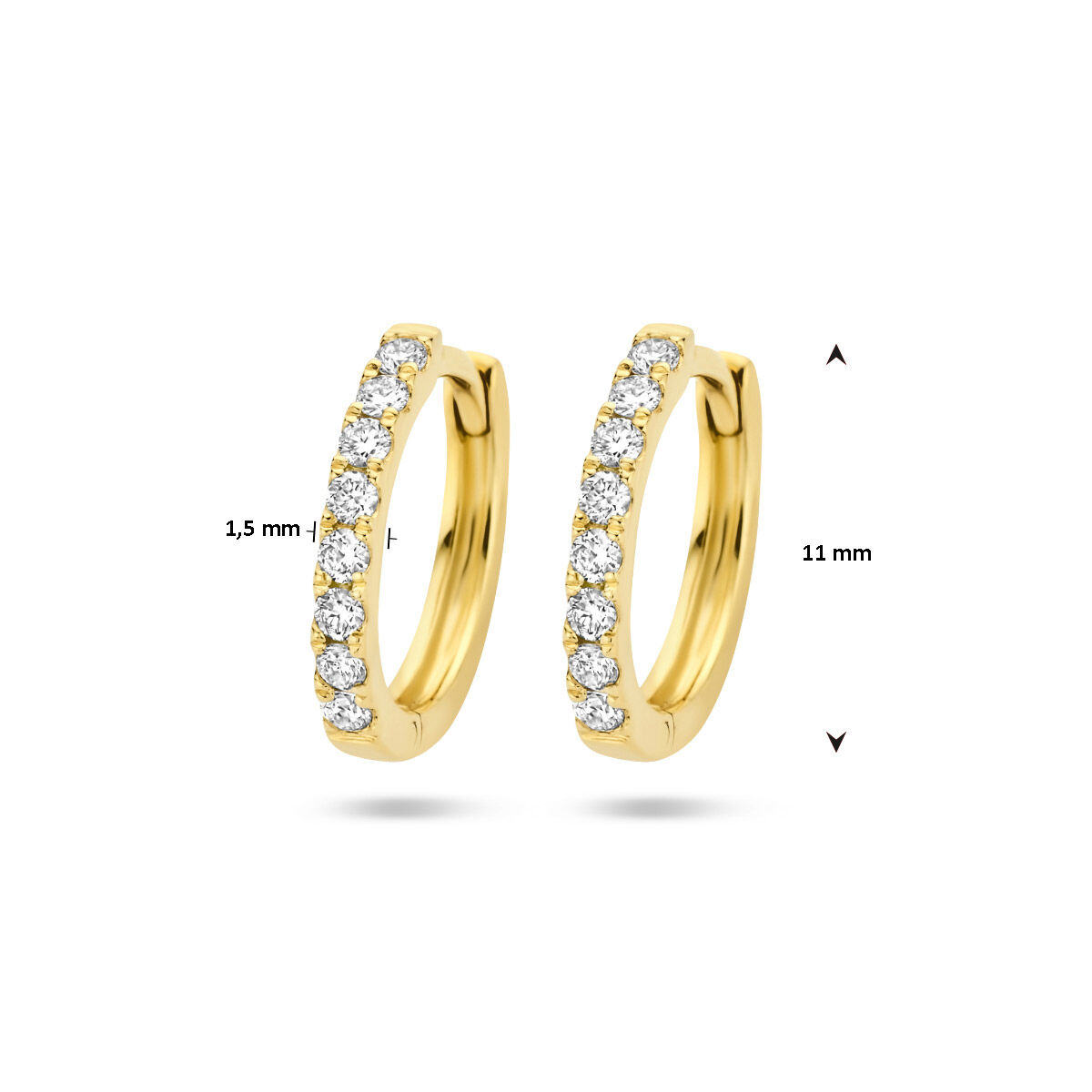 14k Geelgouden klapoorringen met een stevig scharnier uitgevoerd met een schitterende diamant rij. De oorringen hebben een afmeting van 11x1.5mm.