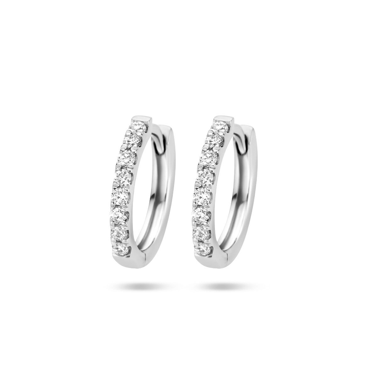 14k Witgouden oorringen met scharnier uitgevoerd met een schitterende diamant rij. De oorringen hebben een afmeting van 11x1.5mm.