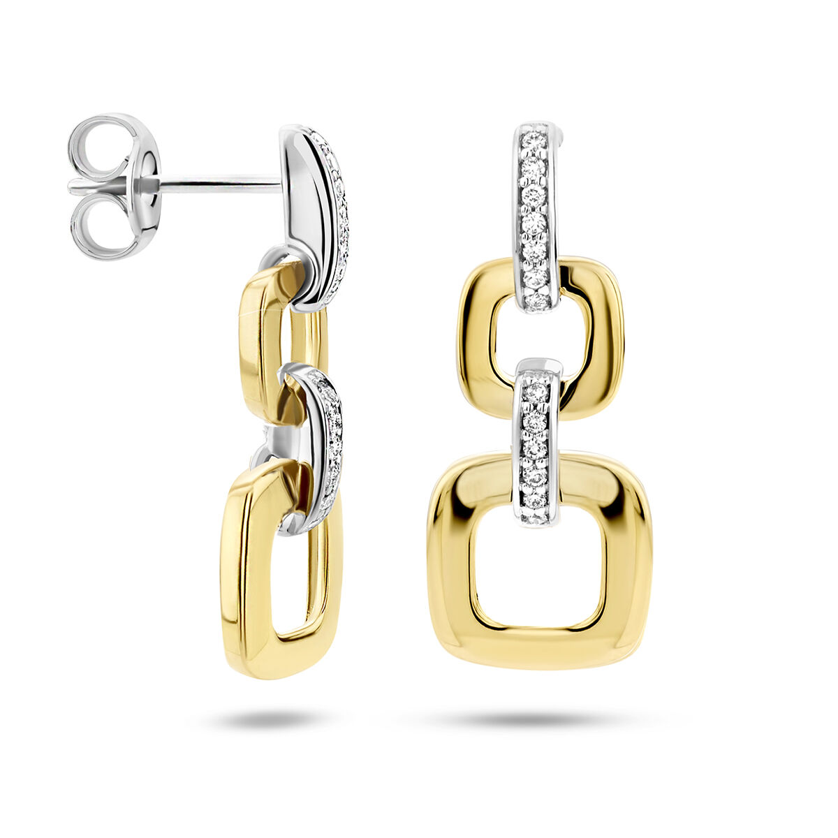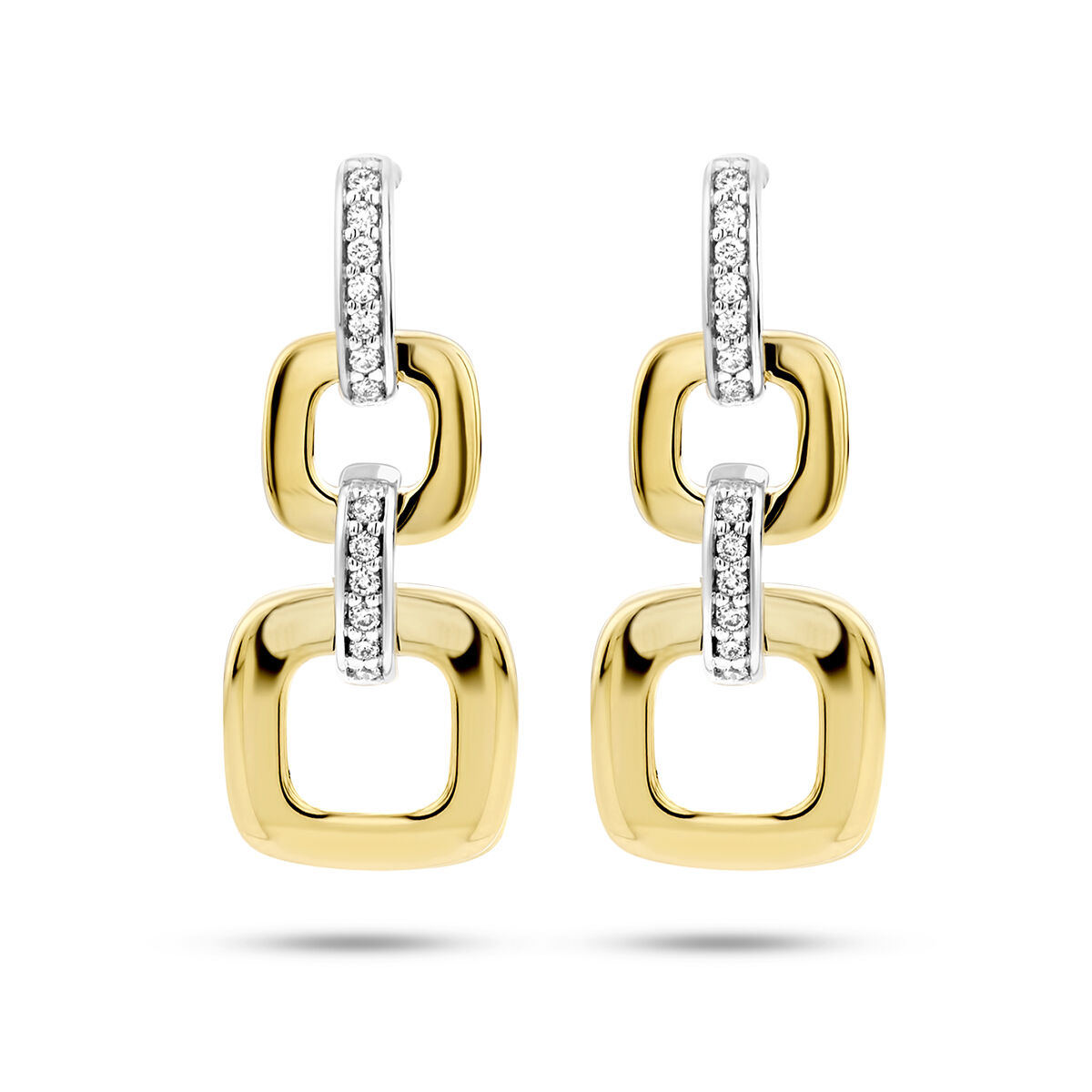 14k Bicolor geel- en witgouden oorhangers uitgevoerd met schitterend diamant. De oorhangers hebben een totale hoogte van 24mm. De totale diamantgewicht is 0.11ct (2x 0.055ct).
