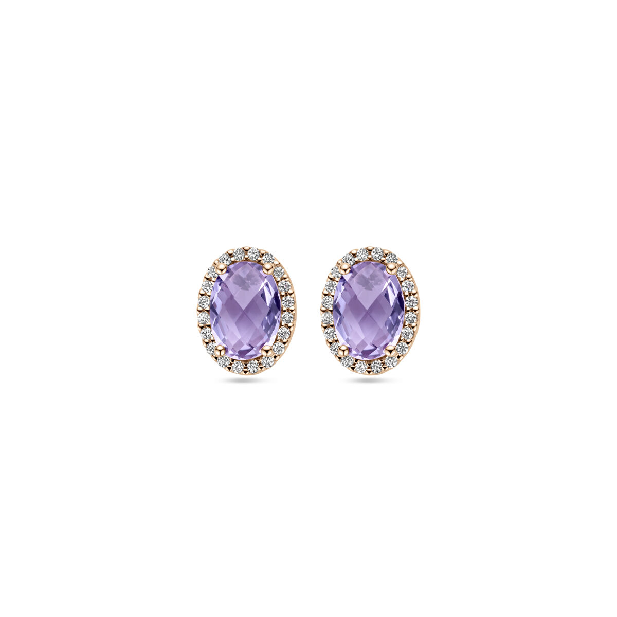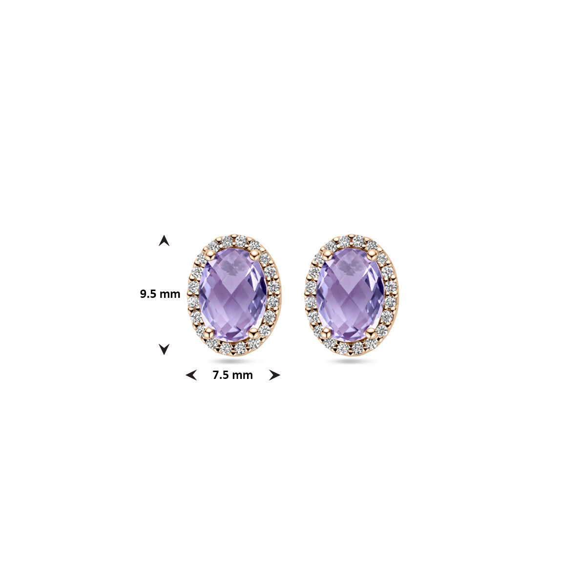 14k Roségouden oorknoppen uitgevoerd met amethist en diamant. De oorknoppen hebben een afmeting van 9.5x7.5mm. Het diamantgewicht is 0.13ct (2x 0.065ct).