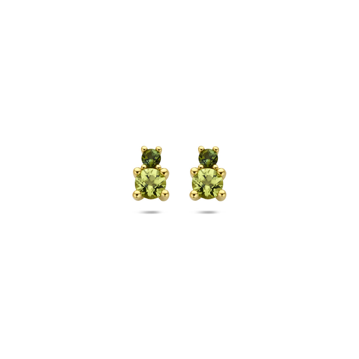 14k Geelgouden oorknoppen uitgevoerd met peridot en groen toermalijn. De oorknoppen hebben een afmeting van 7,5x5mm.