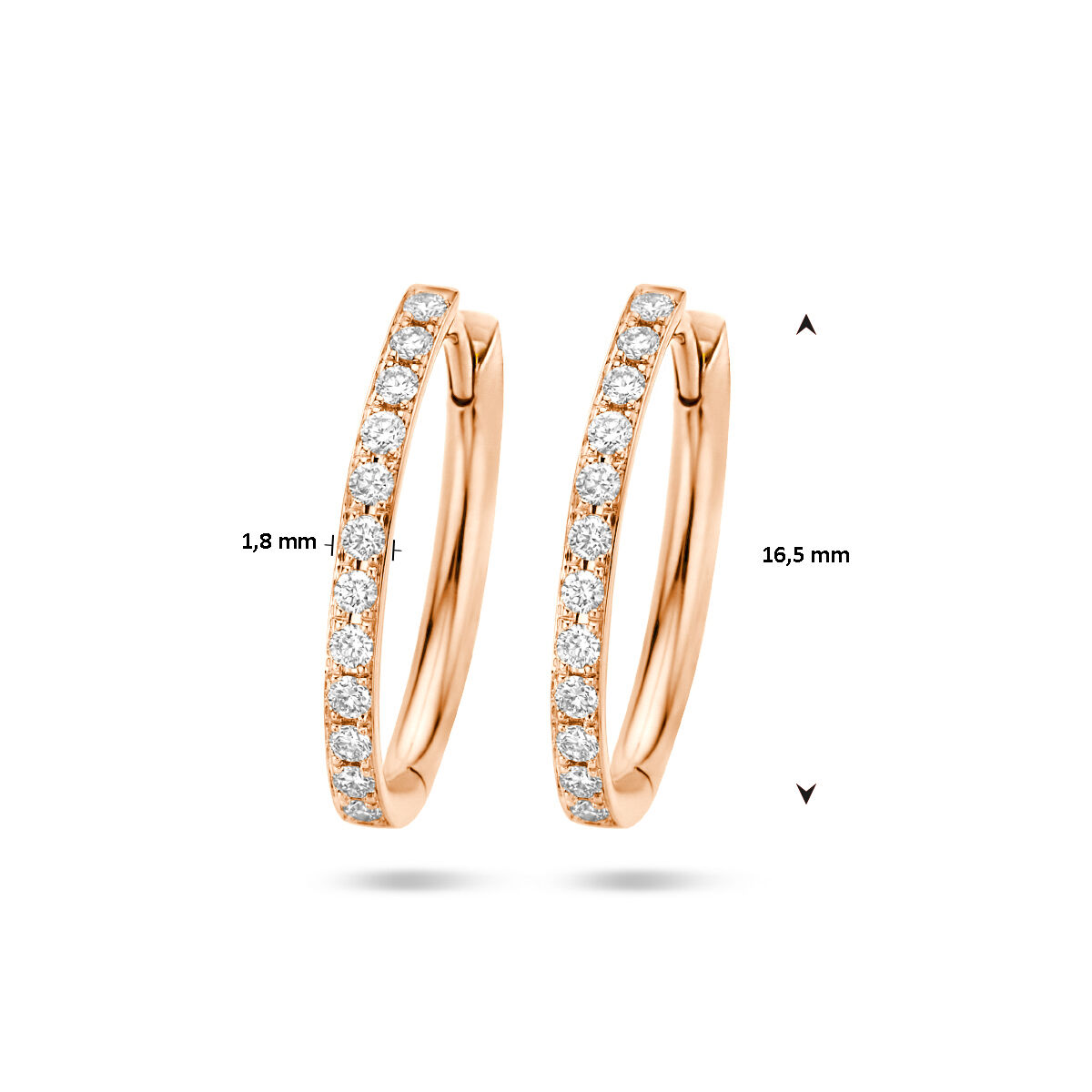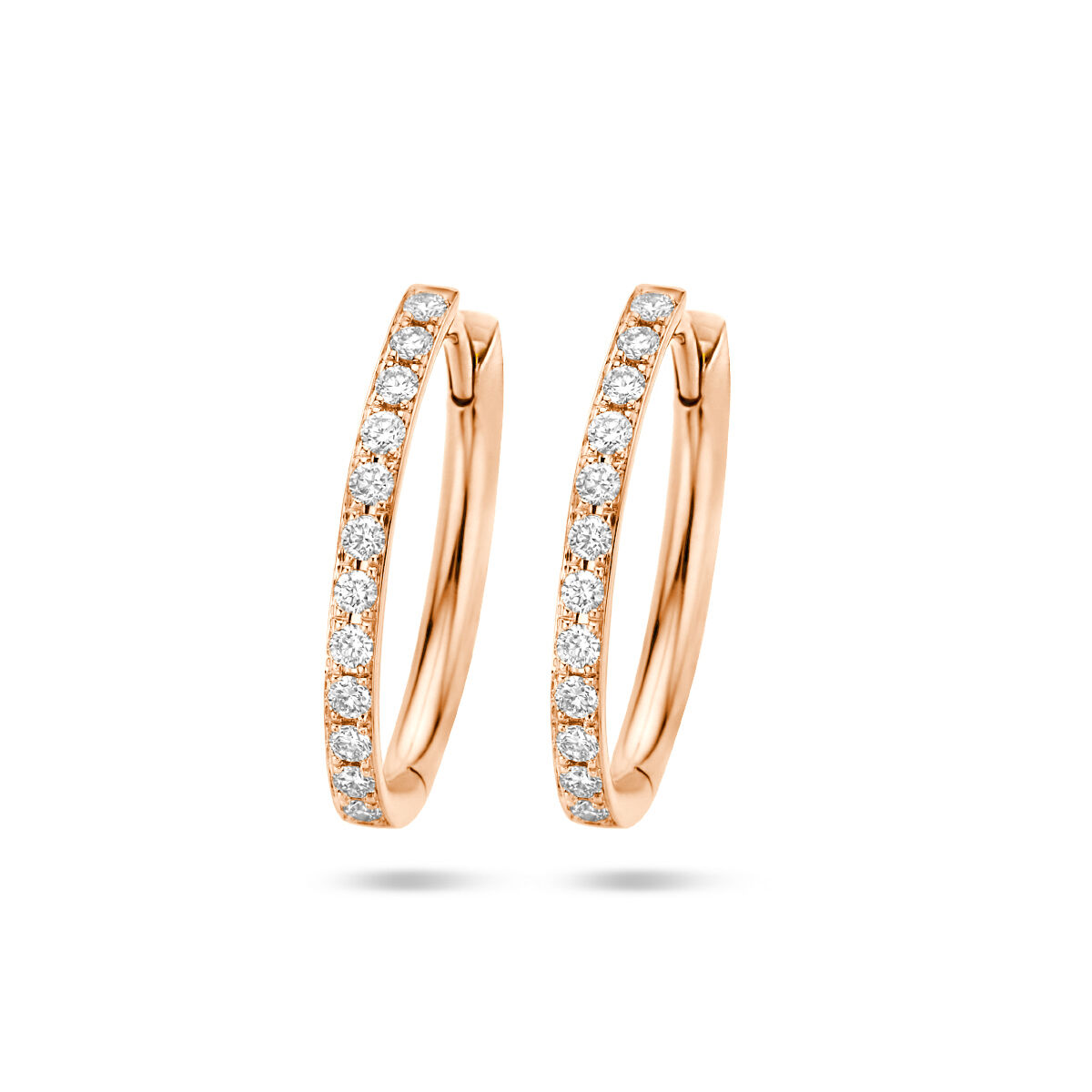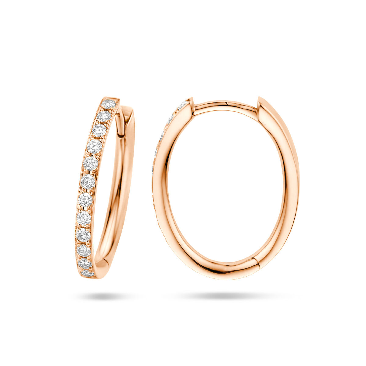Schitterend! Dat gaat iedereen vast zeggen van deze 14k rosegouden oorringen. Aan de voorzijde is een rij transparante witte diamanten geplaatst. De ovale oorring kan gemakkelijk in en uit gedaan worden door het scharnier.