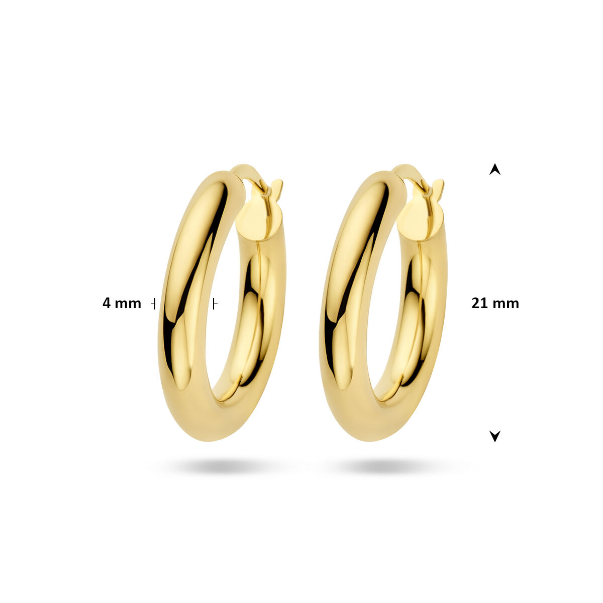 14k Geelgouden oorringen uitgevoerd met een stevige scharnier sluiting. De oorringen hebben een diameter van 21mm.