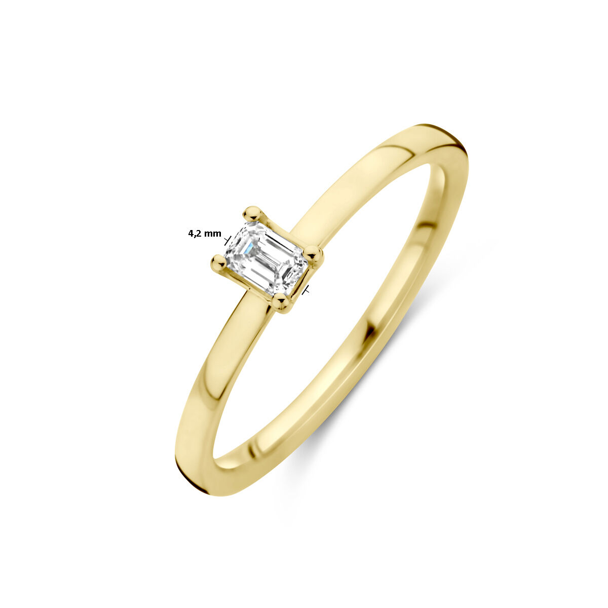 18k Geelgouden ring CNC uitgevoerd met een diamant. De ring heeft een breedte van 4.2mm.