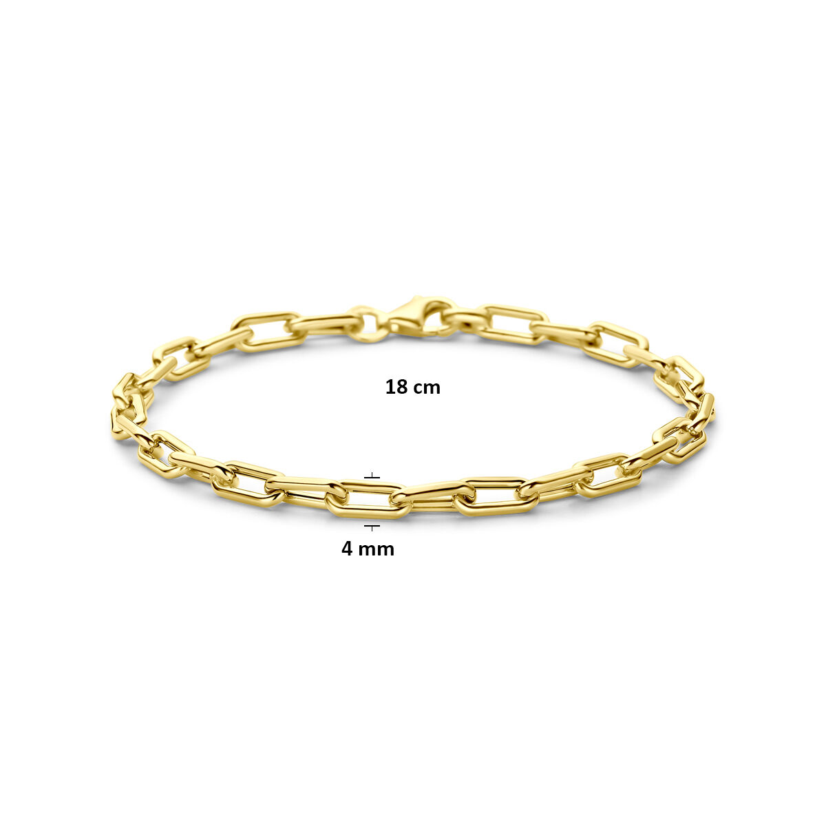 14k Geelgouden armband met een breedte van 4mm. De armband heeft een lengte van 18cm en is uitgevoerd met een karabijnsluiting.