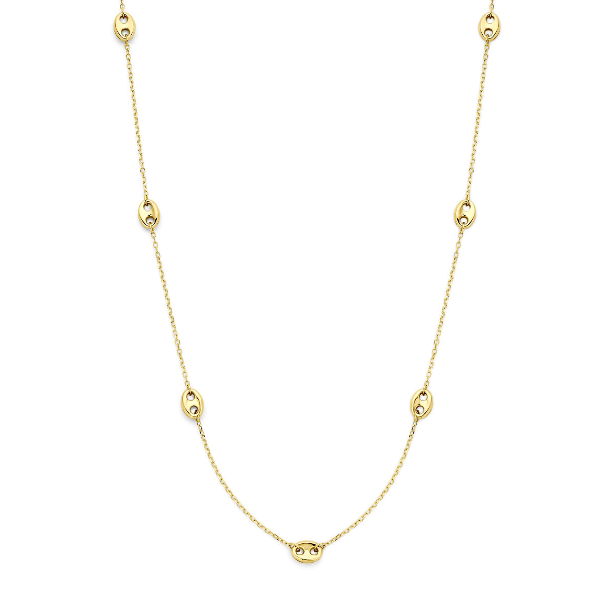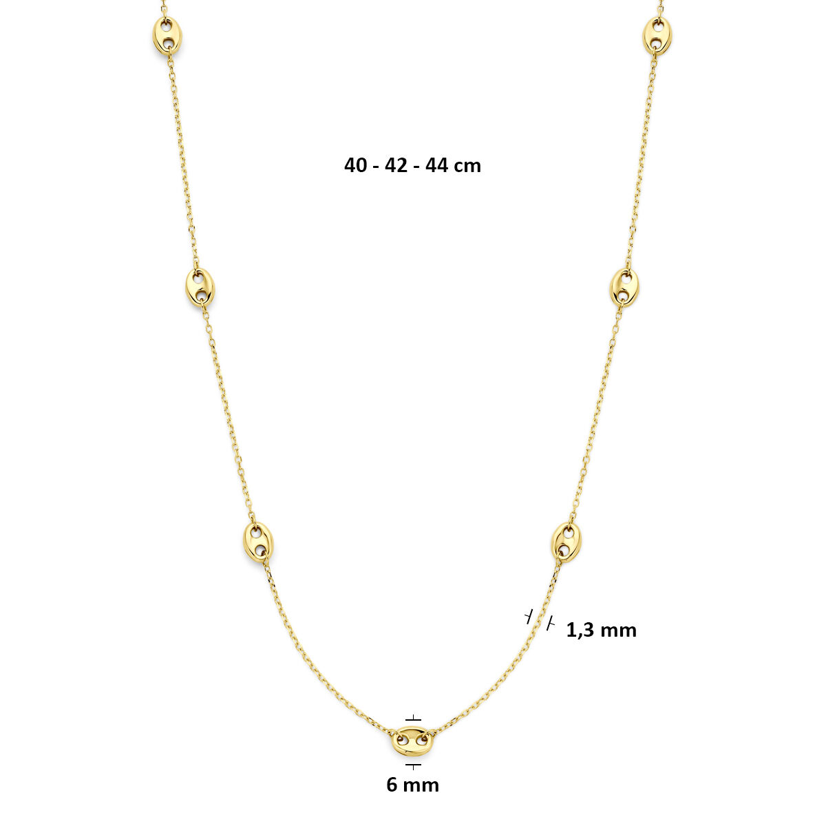 14k Geelgouden collier met koffieboon tussenschakels van 6mm en een draaglengte van 40-42-44cm. Uitgevoerd met karabijnsluiting.