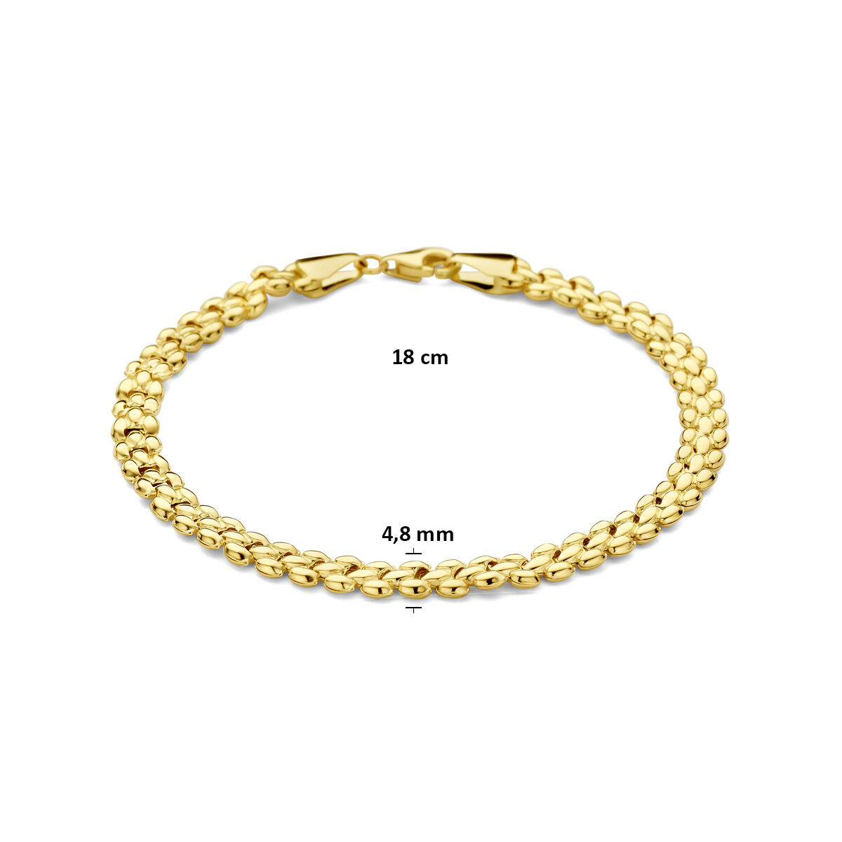 14k Geelgouden armband met een schakelbreedte van 4.8mm. De armband heeft een draaglengte van 18cm en is uitgevoerd met een karabijnsluiting.