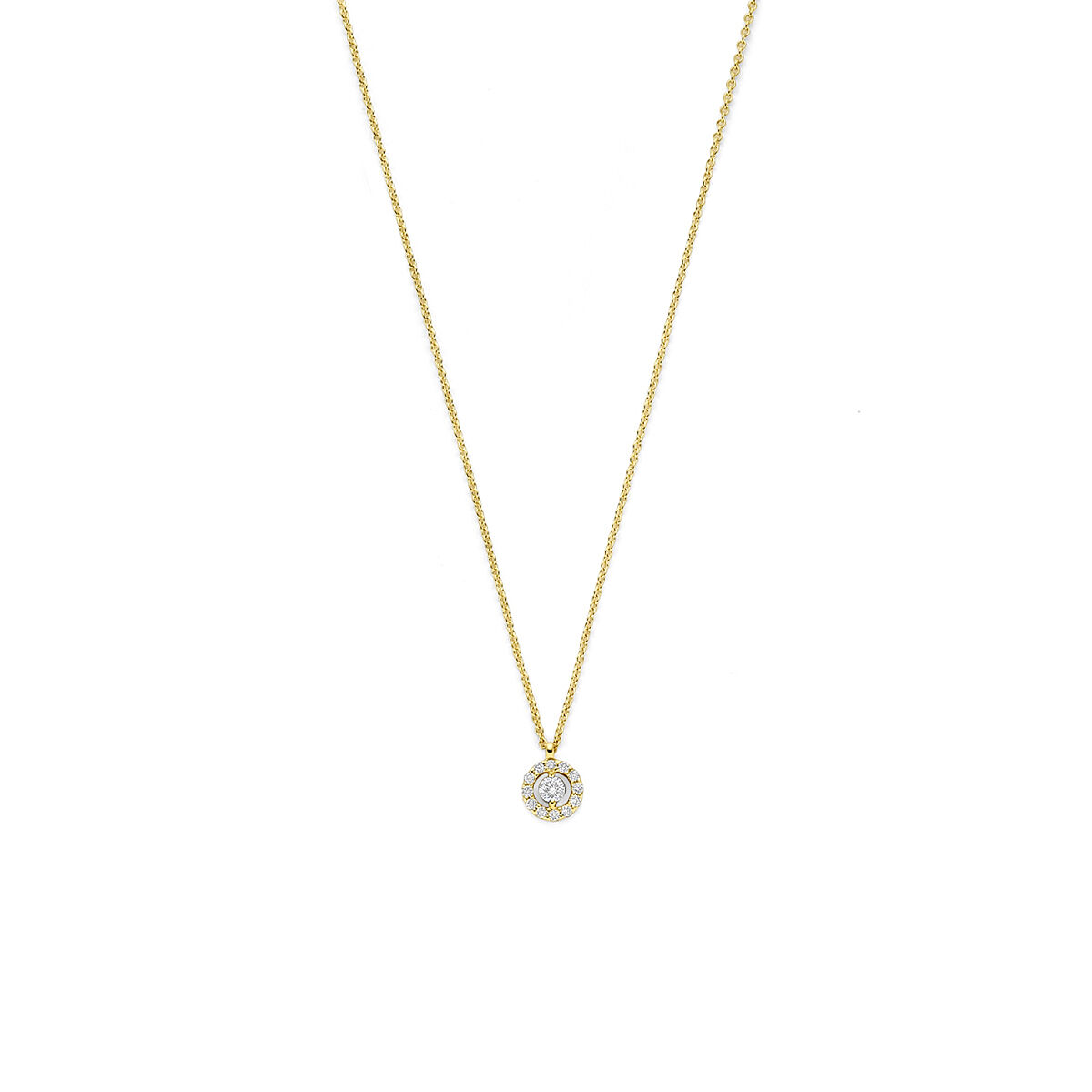 14k Geelgouden collier uitgevoerd met diamant. Het collier heeft draaglengtes van 43-44-45cm en een schakelbreedte van 1mm. Het totale diamantgewicht is 0.14ct.