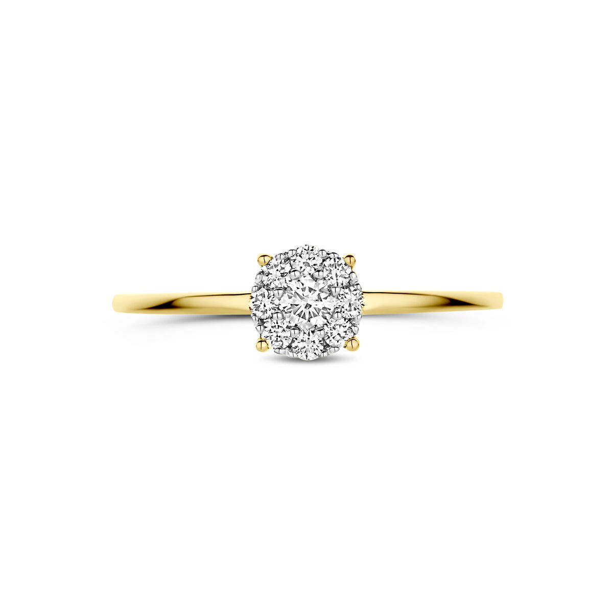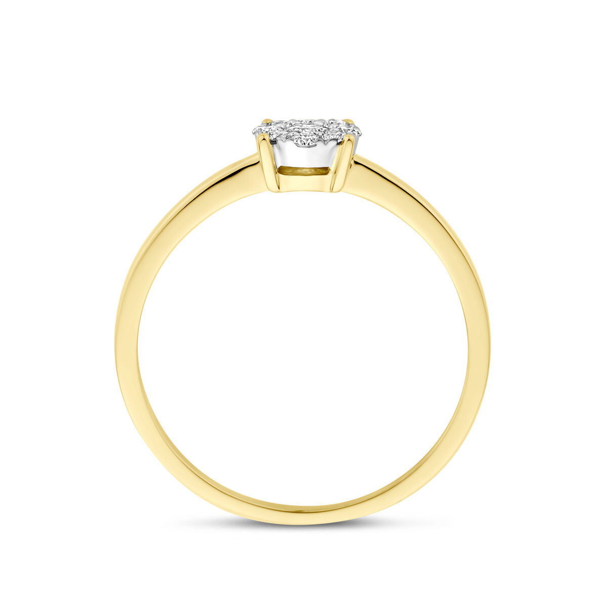 14k Bicolor geel en witgouden ring uitgevoerd met diamant. De steen heeft een diameter van 5.5mm. Het totale diamantgewicht is 0.19ct.