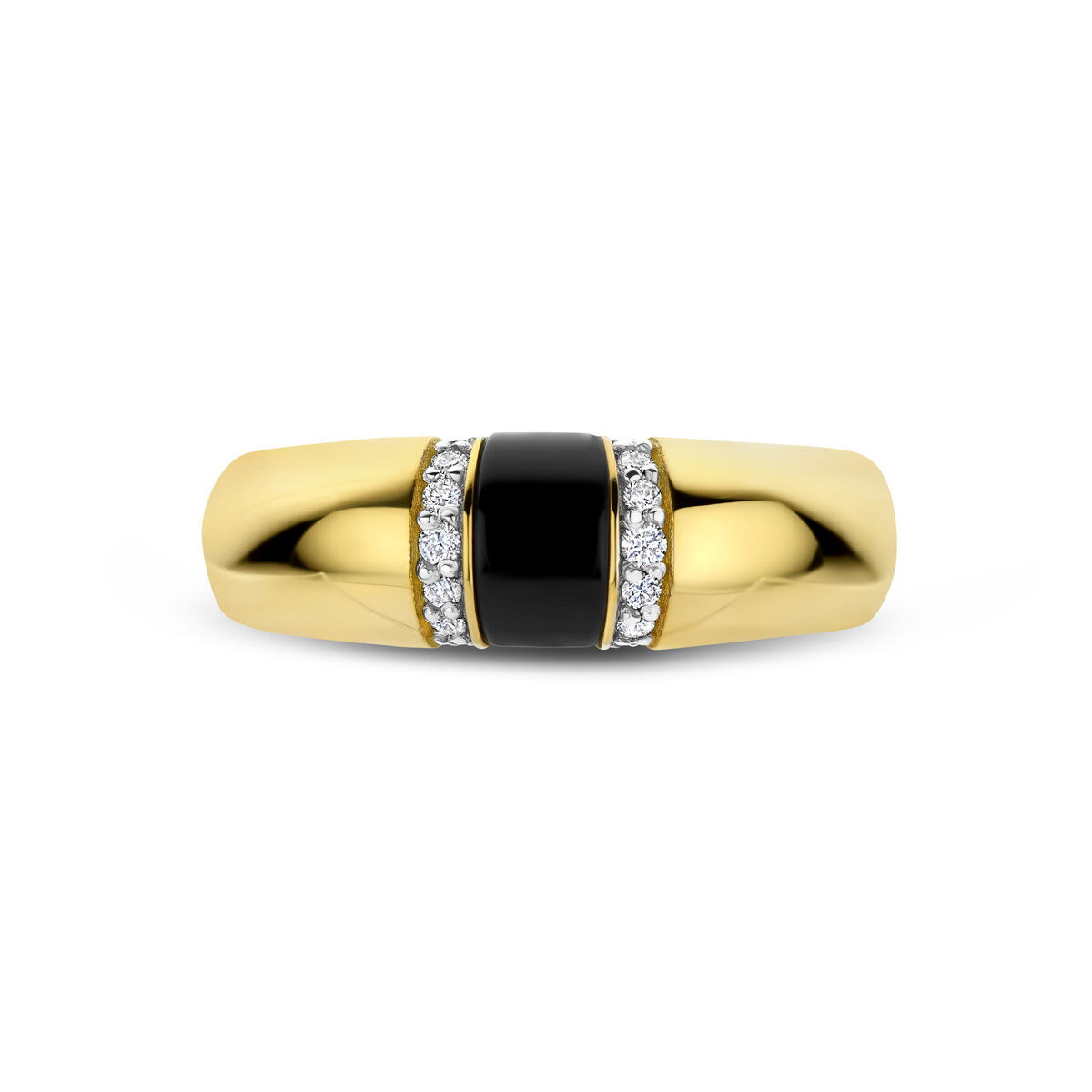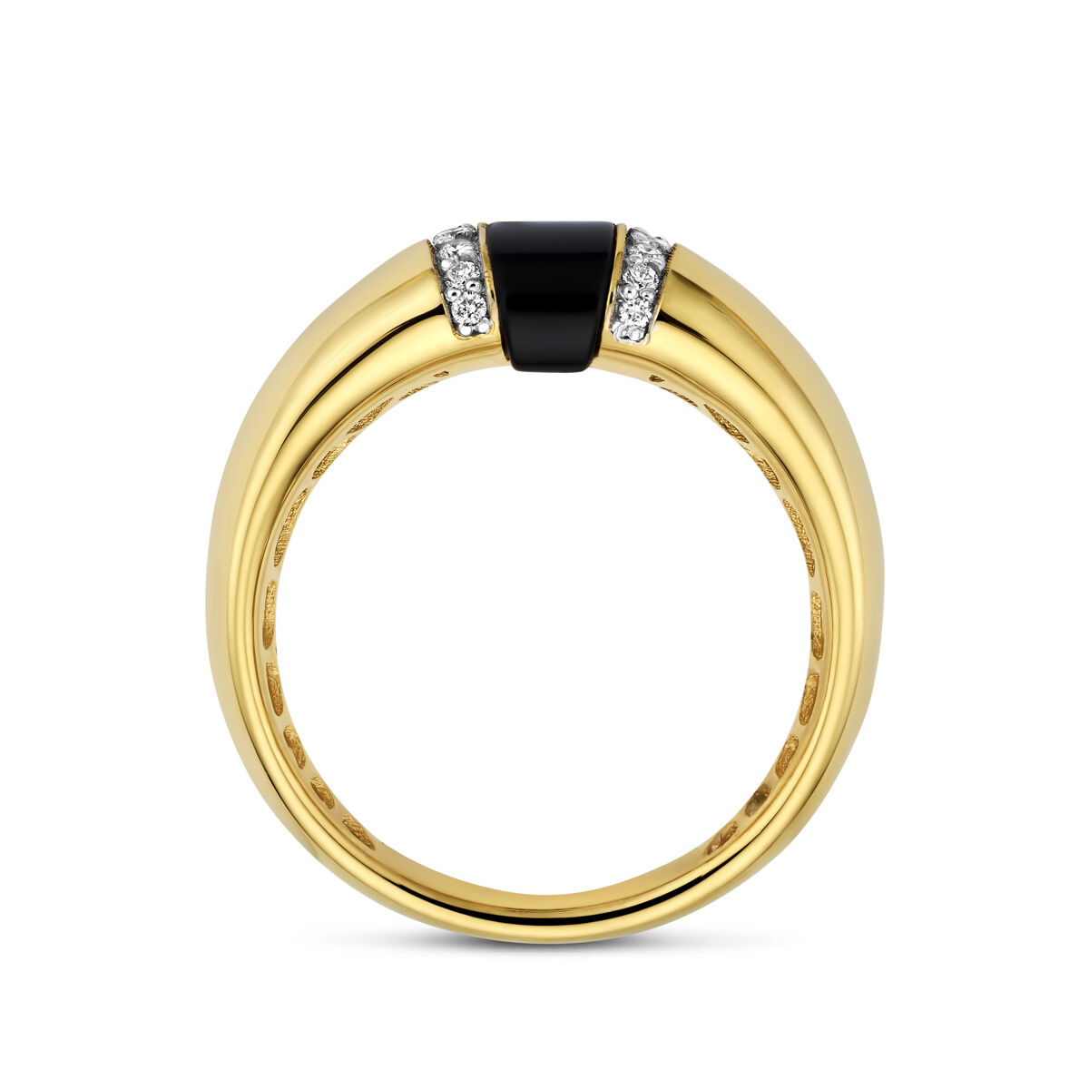 14k Geelgouden ring uitgevoerd met onyx en diamant. De ring heeft een breedte van 6.5mm. Het totale diamantgewicht is 0.10ct.