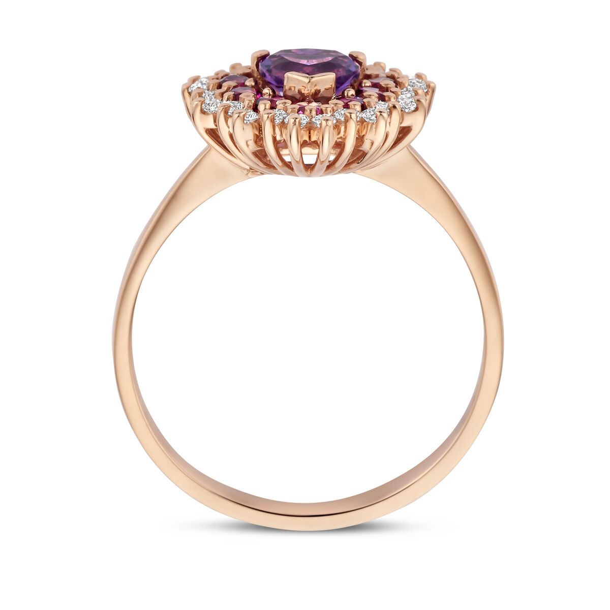 14k Roségouden ring uitgevoerd in de vorm van een hart met amethist, rhodoliet en diamant. De ring heeft een breedte van 12.5mm. Het totale diamantgewicht is 0.19ct.
