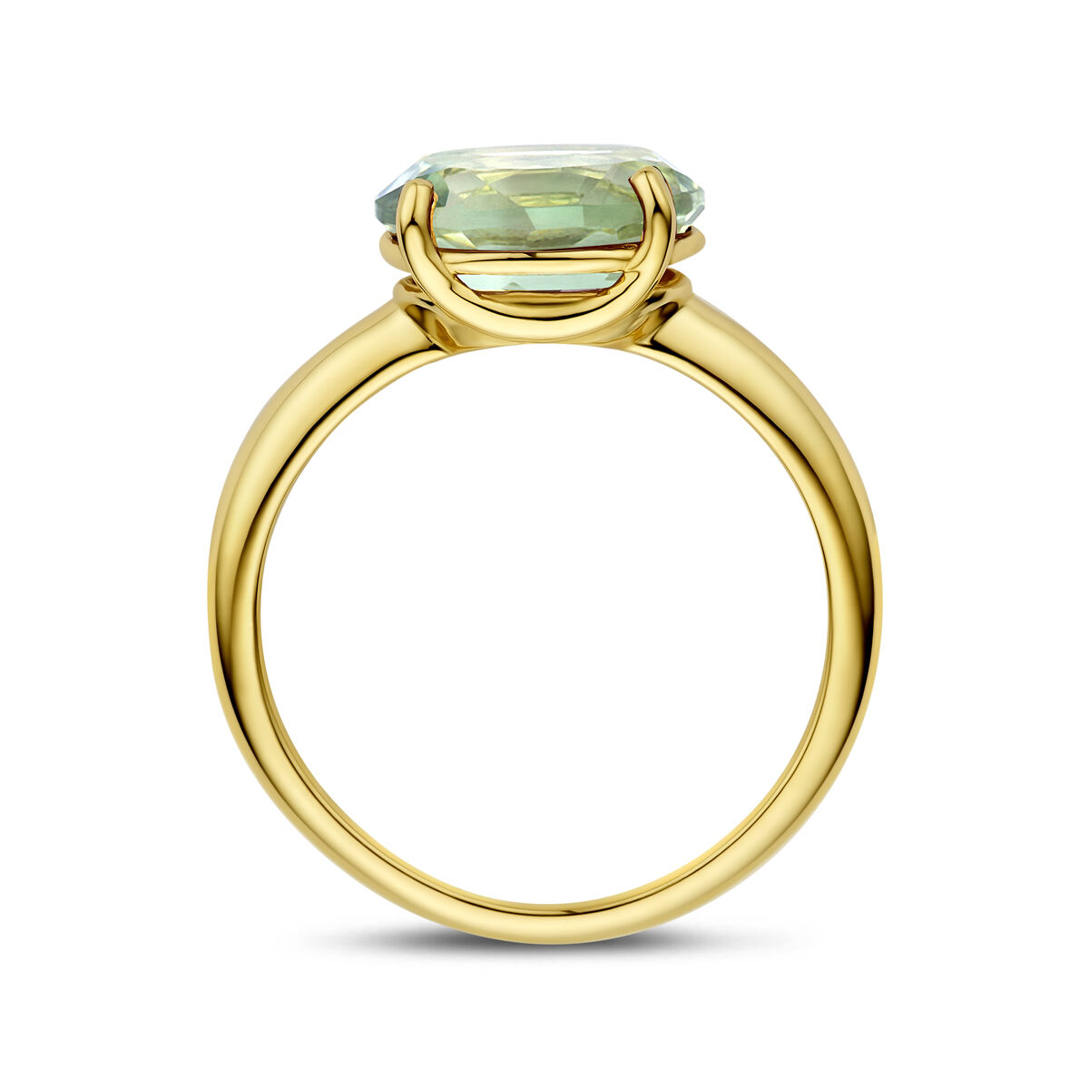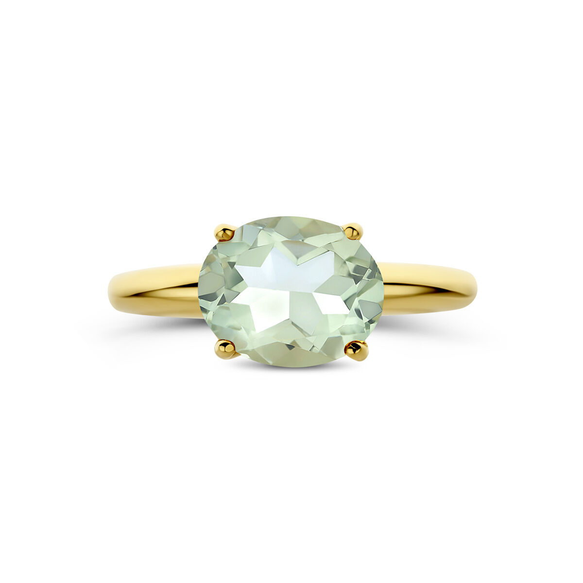 14k Geelgouden ring uitgevoerd met groen amethist. De ring heeft een afmeting van 10x8mm.