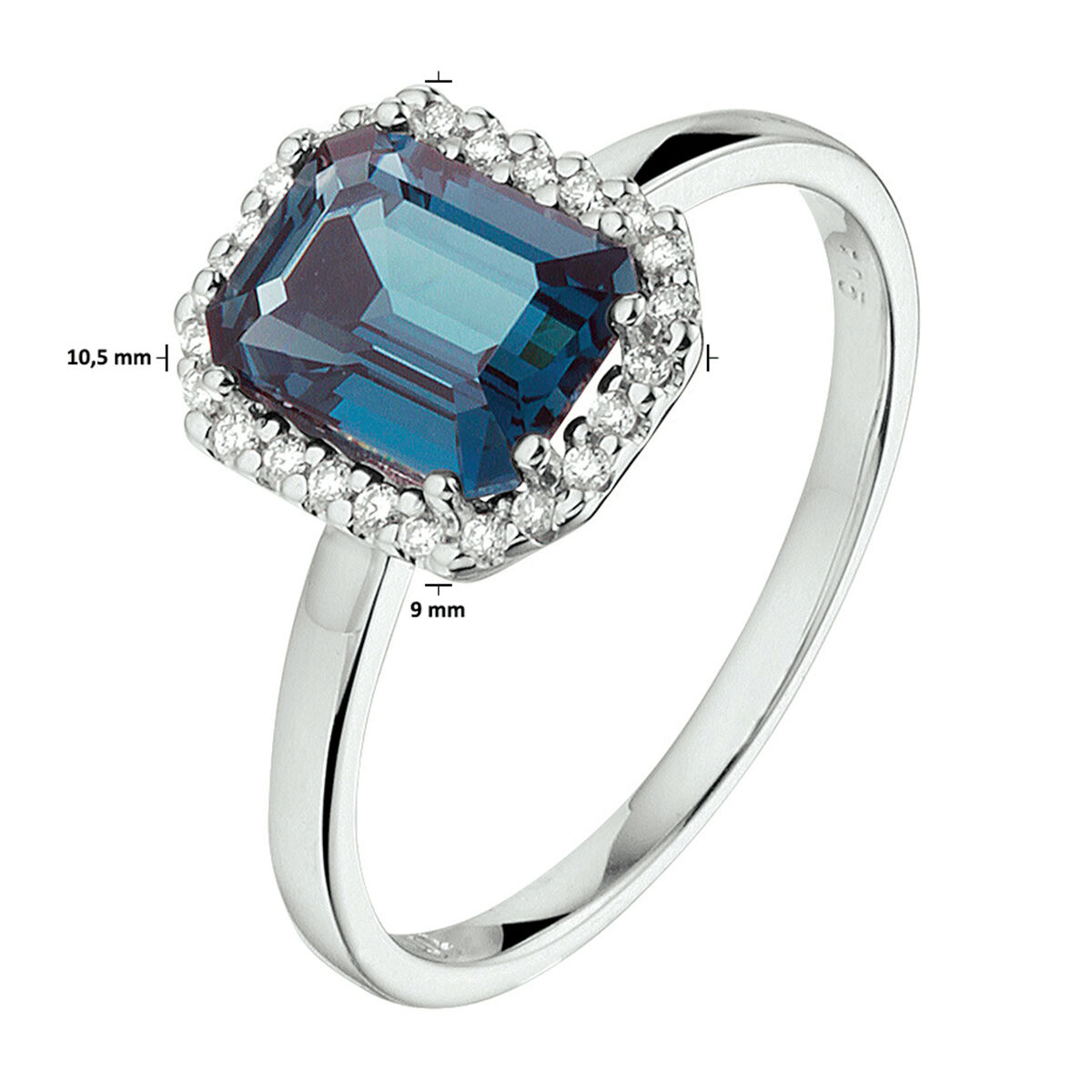 14k Witgouden ring met schitterende London blue topaas en een diamant rij. De ring heeft een breedte van 9mm en een steenmaat van 8x6mm.