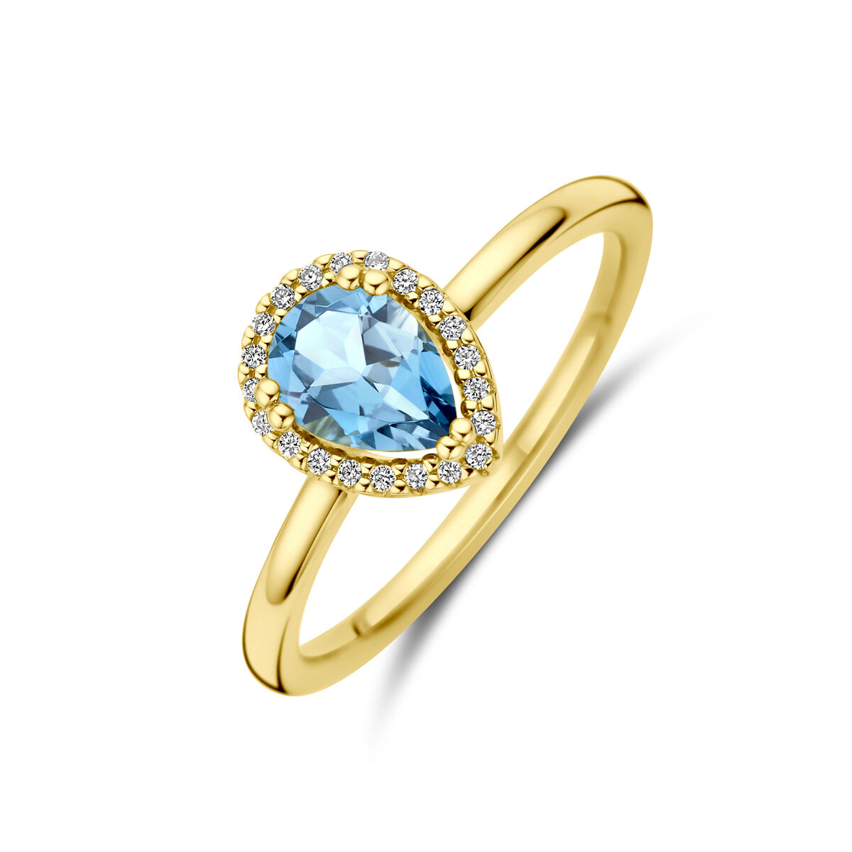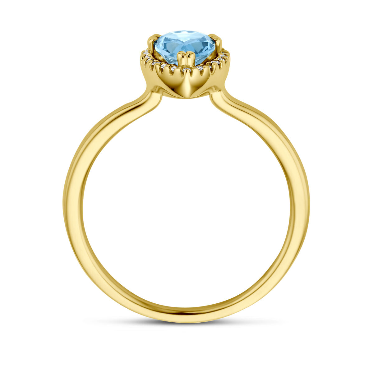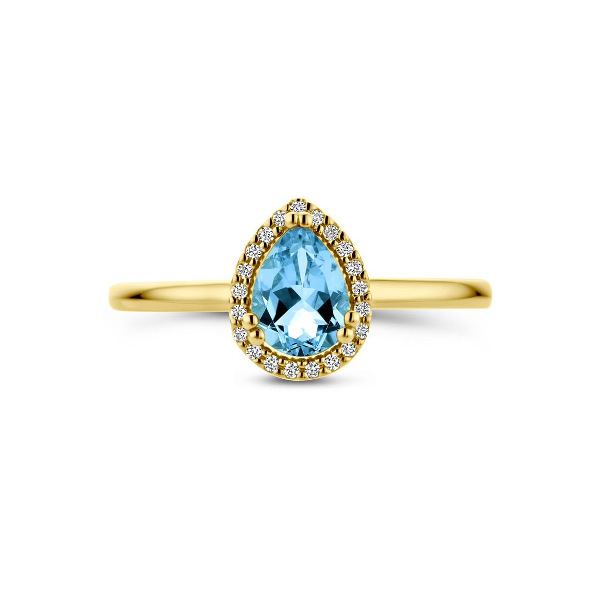 14k Geelgouden ring uitgevoerd met london blue topaas en diamanten. De ring heeft een breedte van 9.5mm. Het diamantgewicht is 0.06ct.