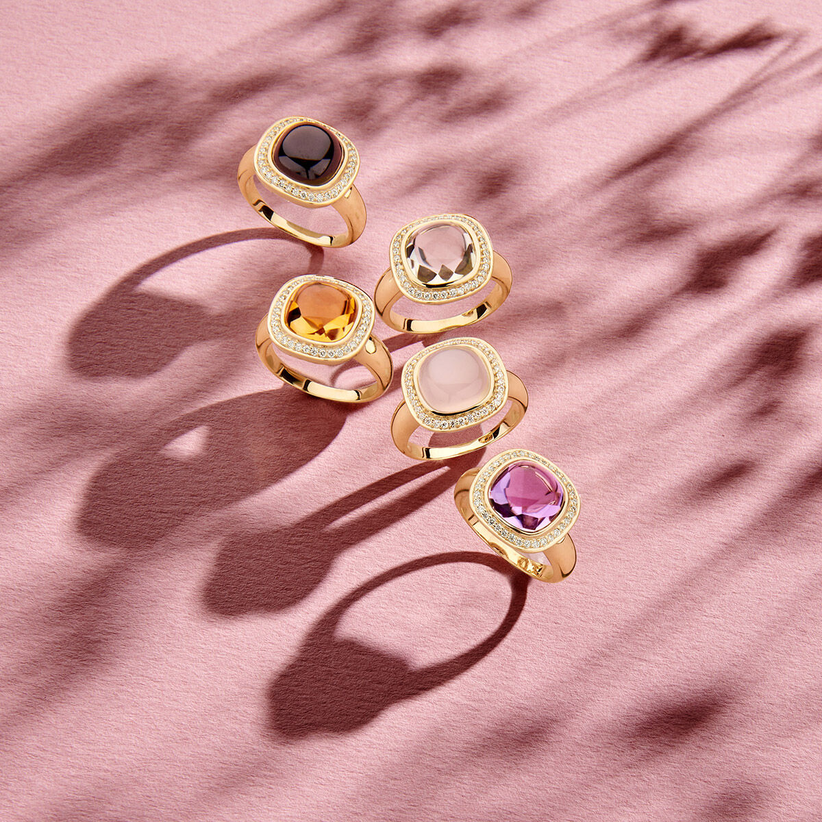 14k Geelgouden ring uitgevoerd met citrien en diamanten. De citrien heeft een cushion vorm en is aan de bovenzijde cabochon en aan de onderzijde briolet geslepen. De ring heeft een breedte van 14mm.