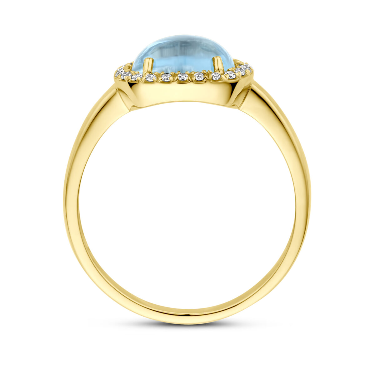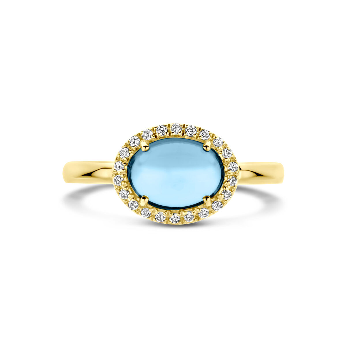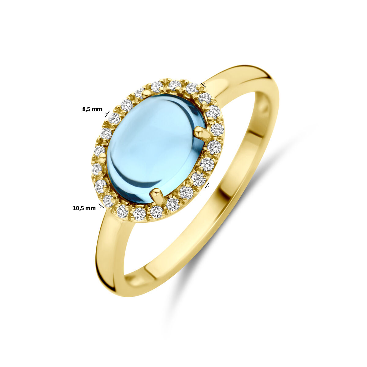 14k Geelgouden ring uitgevoerd met diamant en blauw topaas. De ring heeft een afmeting van 8.5x10mm. De totale diamantgewicht is 0.09ct.