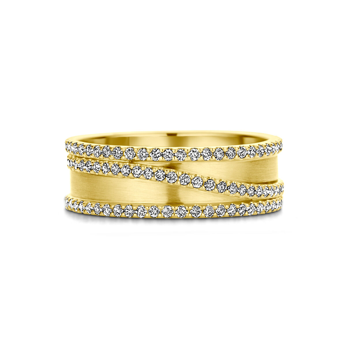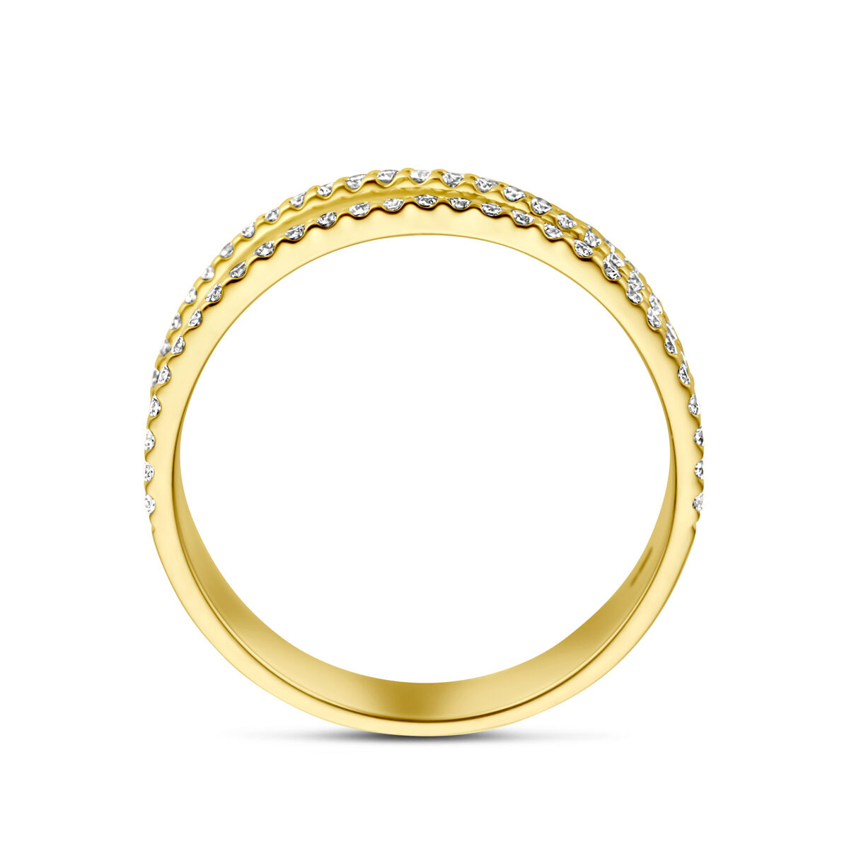14k Geelgouden ring uitgevoerd met schitterende diamanten. De ring heeft een breedte 6.4mm.