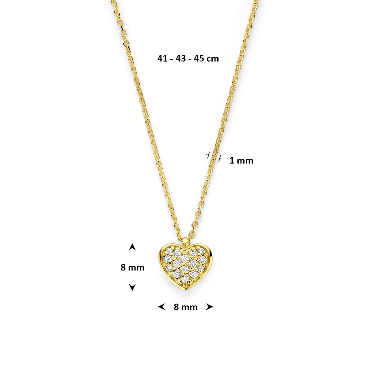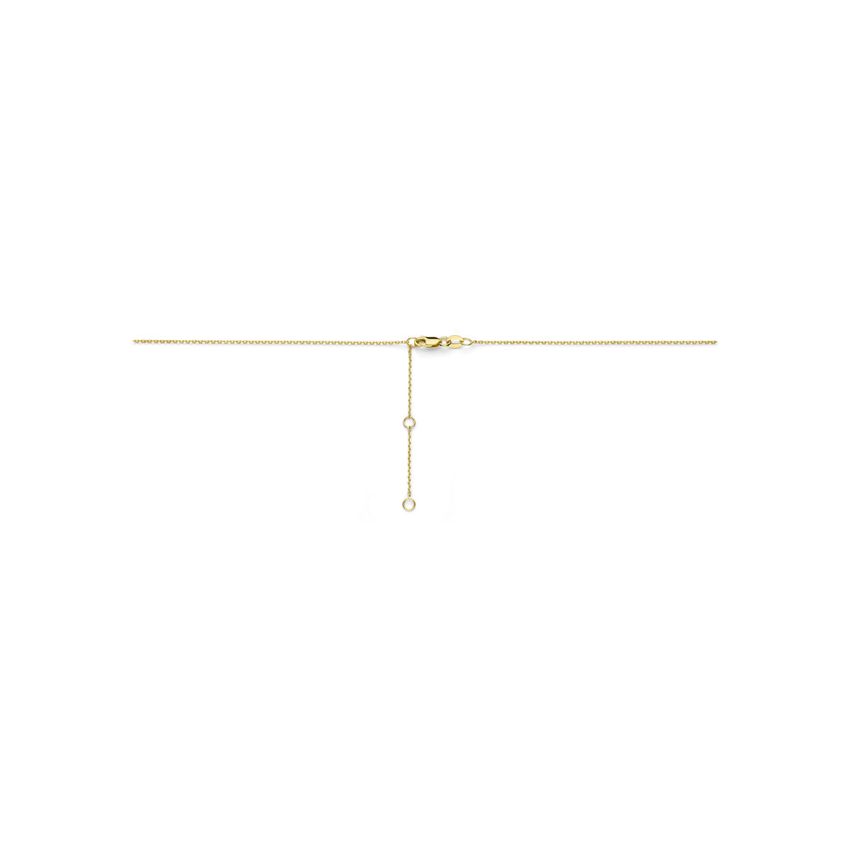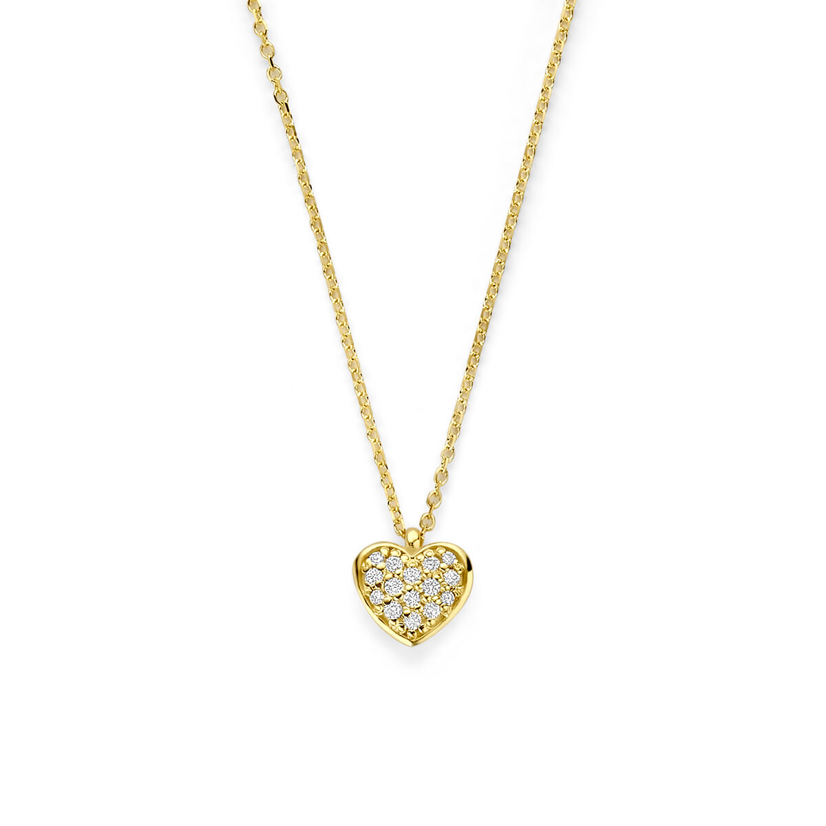 14k Geelgouden collier uitgevoerd met een hartje diamant. Het collier heeft draaglengtes van 41-43-45cm en een schakelbreedte van 1mm. Het totale diamantgewicht is 0.11ct.