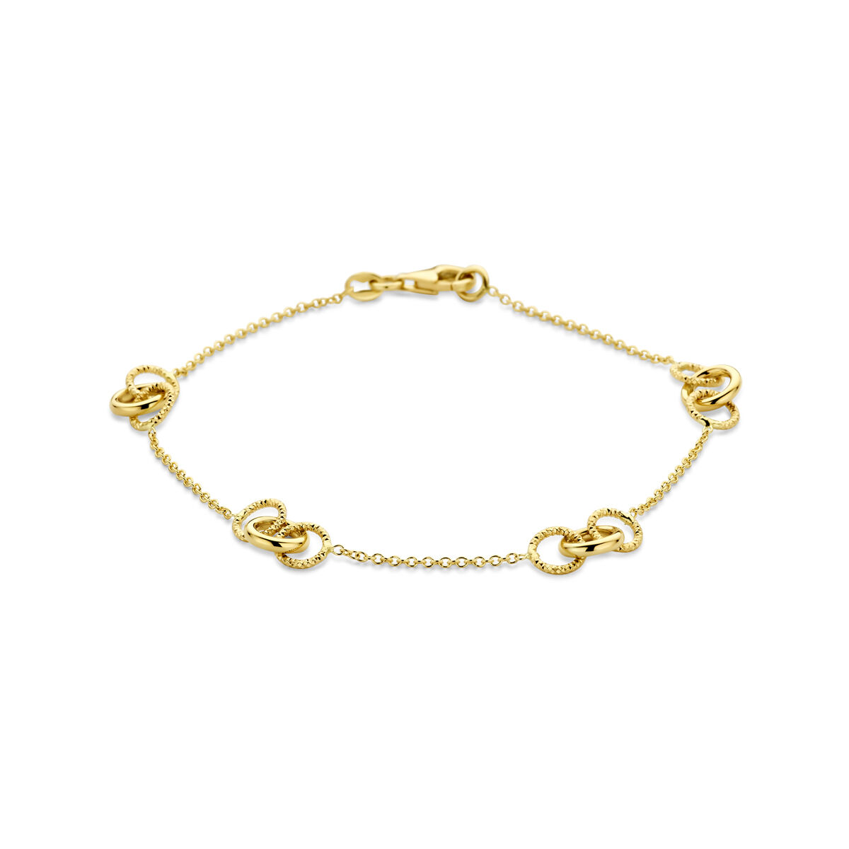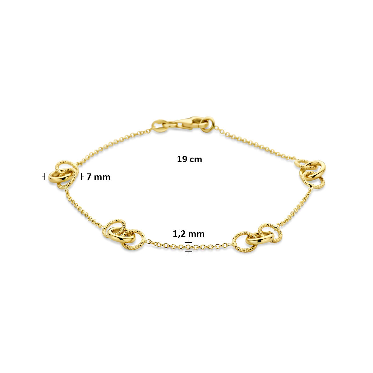 14k Geelgouden armband met rondjes. De armband heeft een draaglengte van 19cm en een schakelbreedte van 1.2mm. Uitgevoerd met karabijnsluiting.