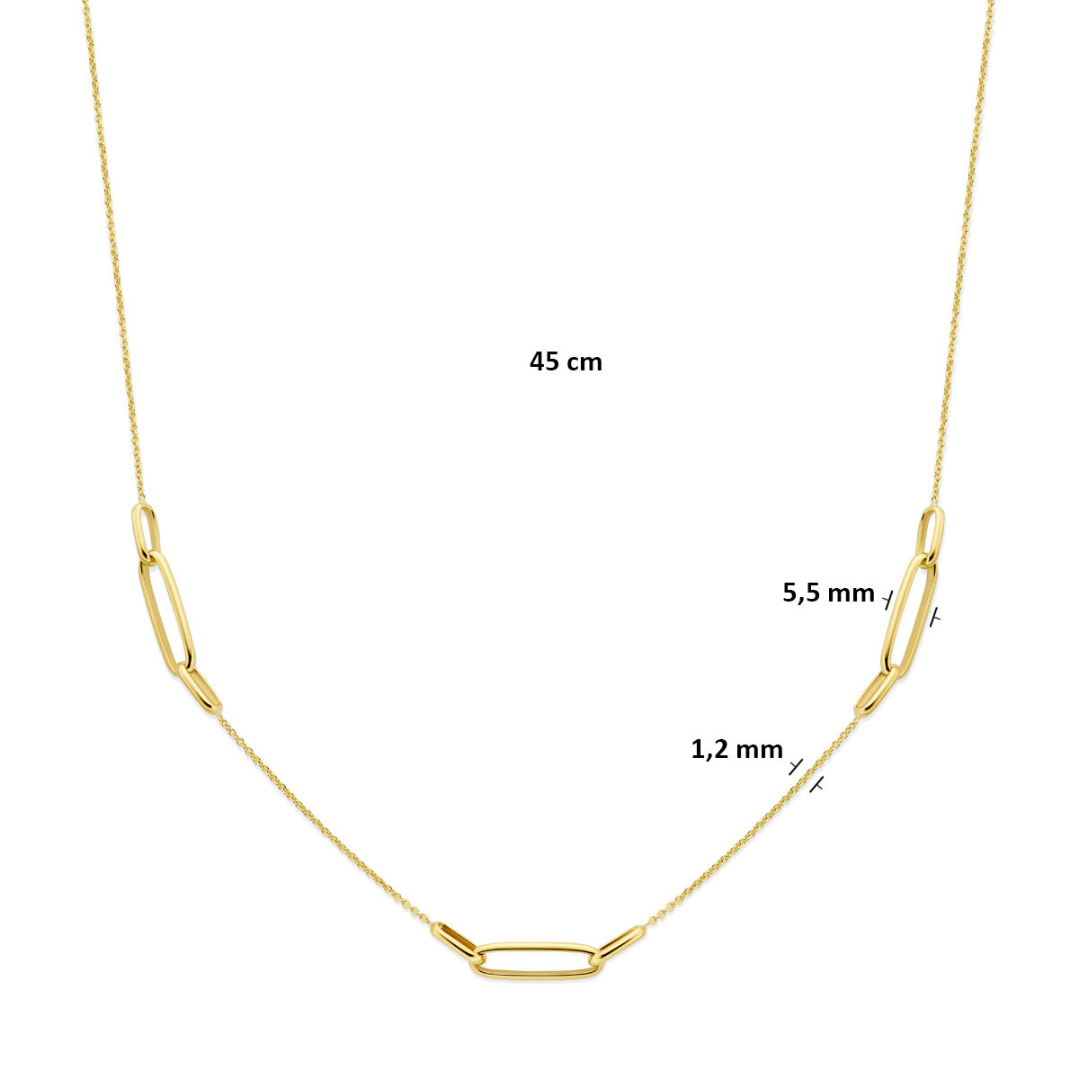 14k Geelgouden collier met een schakelbreedte van 1,2mm en een draaglengte van 45cm. Uitgevoerd met karabijnsluiting.