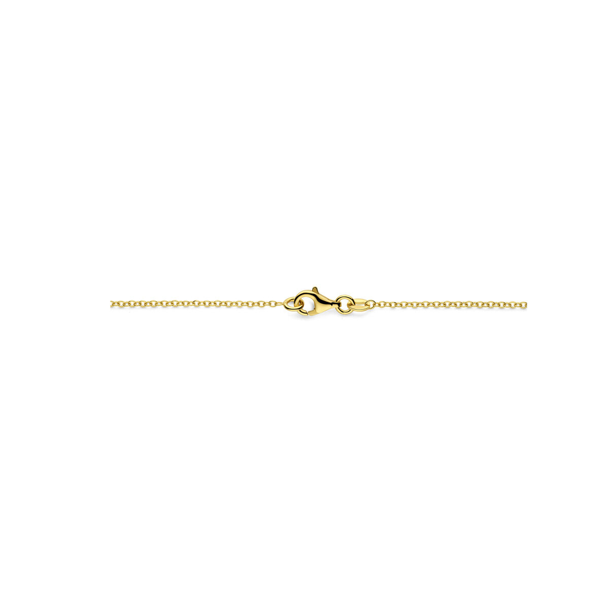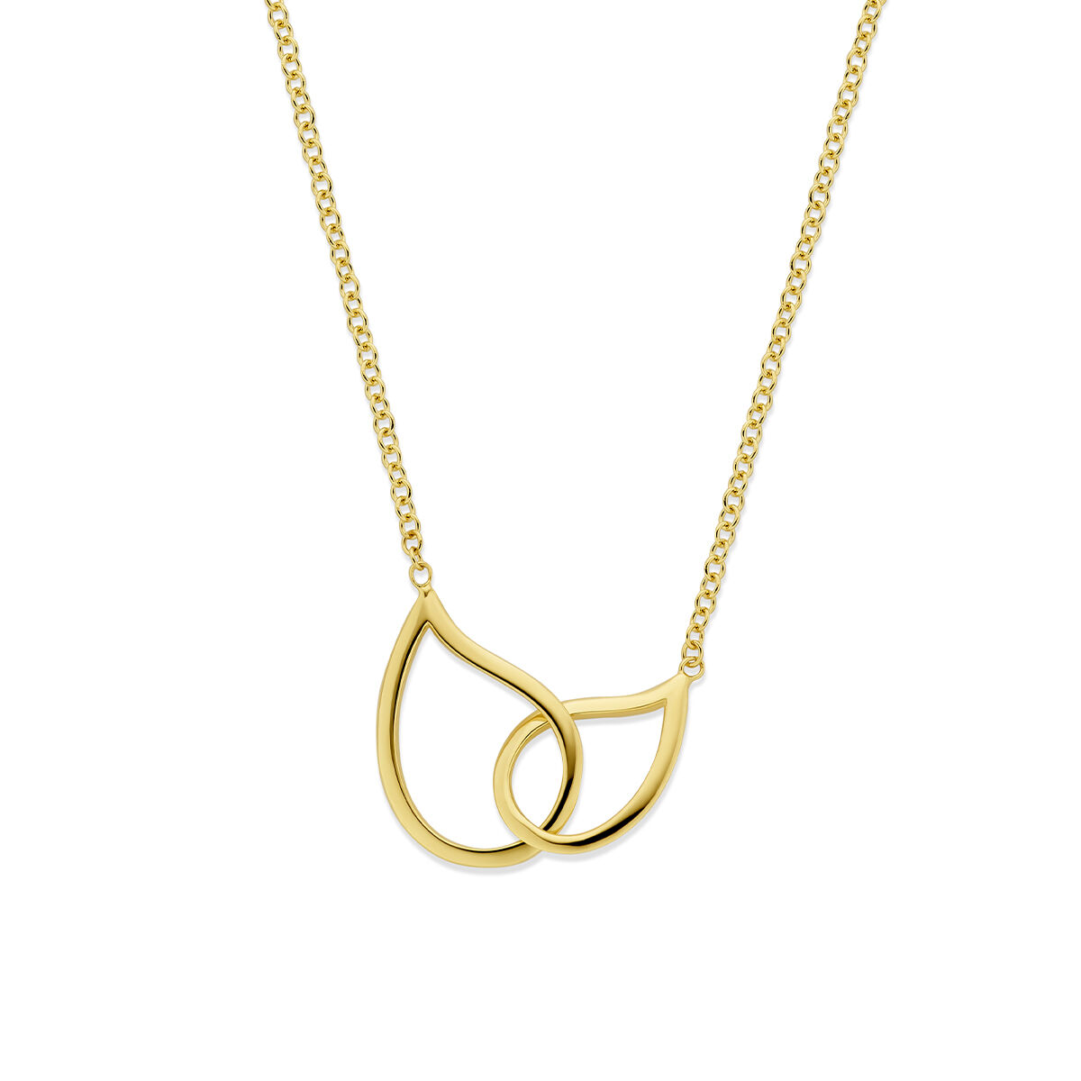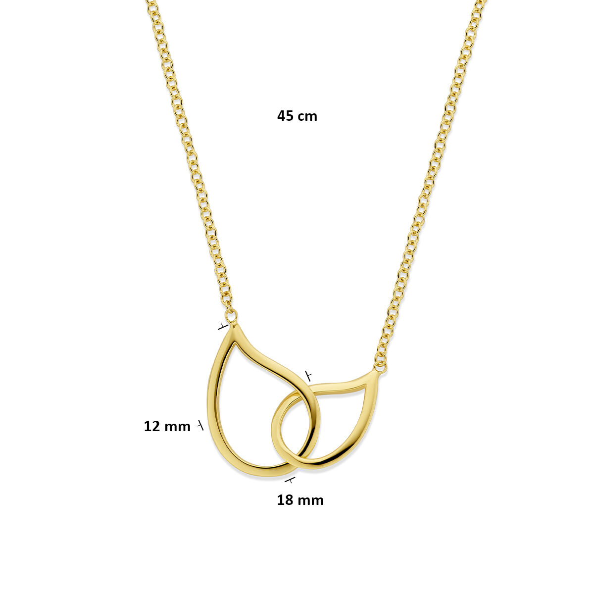 14k Geelgouden collier uitgevoerd met twee hangers in de vorm van een druppel. Het collier heeft een schakelbreedte van 1,5 mm en een draaglengte van 45cm. Uitgevoerd met een karabijnsluiting.