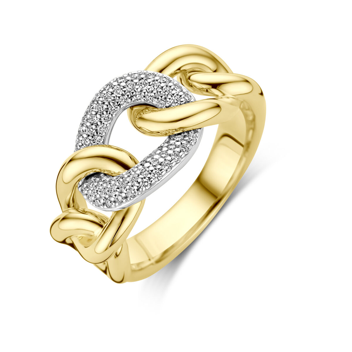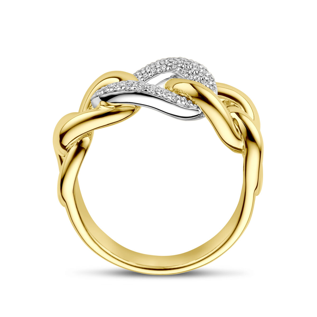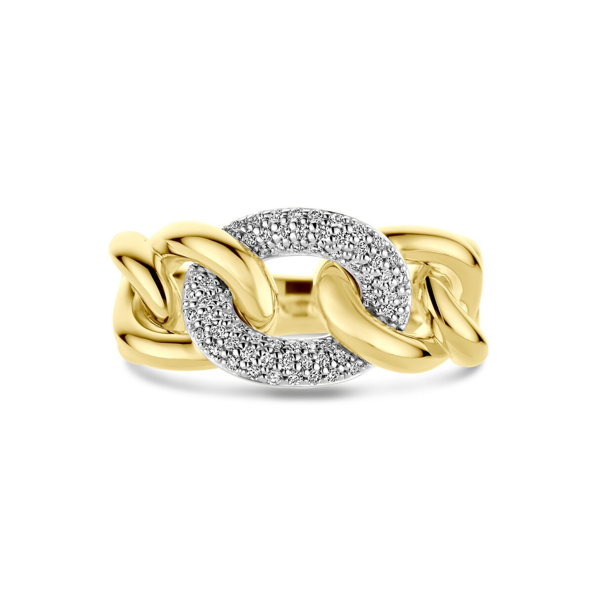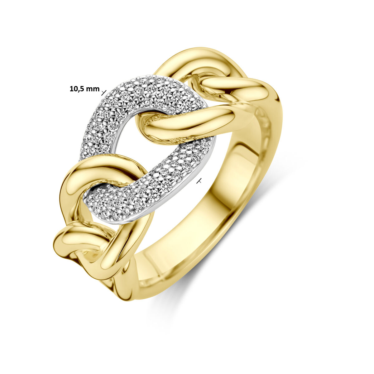 14k Bicolor geel- en witgouden ring uitgevoerd met een schitterende diamant. De ring heeft een breedte van 10.5mm.