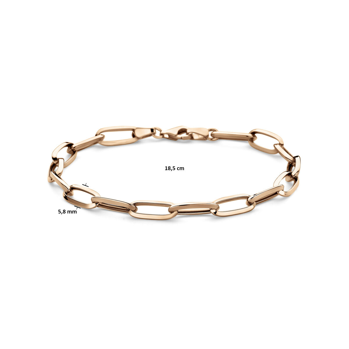 14k Roségouden armband met een schakelbreedte van 5.8mm. De armband is uitgevoerd met een karabijn sluiting en heeft een draaglengte van 18,5cm.